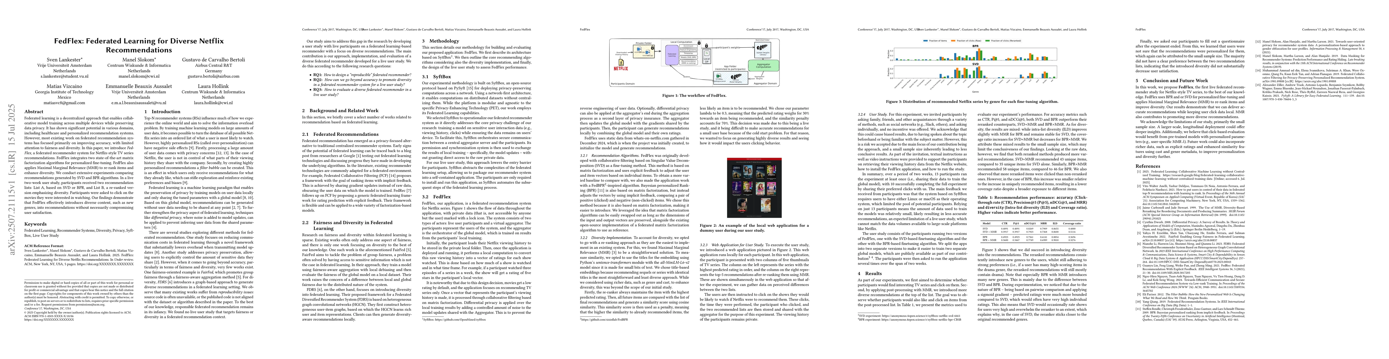 Federated learning is a decentralized approach that enables collaborative model training across multiple devices while preserving data privacy. It has shown significant potential in various domains, including healthcare and personalized recommendation systems. However, most existing work on federated recommendation systems has focused primarily on improving accuracy, with limited attention to fairness and diversity. In this paper, we introduce FedFlex, a federated recommender system for Netflix-style TV series recommendations. FedFlex integrates two state-of-the-art matrix factorization algorithms for personalized fine-tuning. FedFlex also applies Maximal Marginal Relevance (MMR) to re-rank items and enhance diversity. We conduct extensive experiments comparing recommendations generated by SVD and BPR algorithms. In a live two-week user study, participants received two recommendation lists: List A, based on SVD or BPR, and List B, a re-ranked version emphasizing diversity. Participants were asked to click on the movies they were interested in watching. Our findings demonstrate that FedFlex effectively introduces diverse content, such as new genres, into recommendations without necessarily compromising user satisfaction.