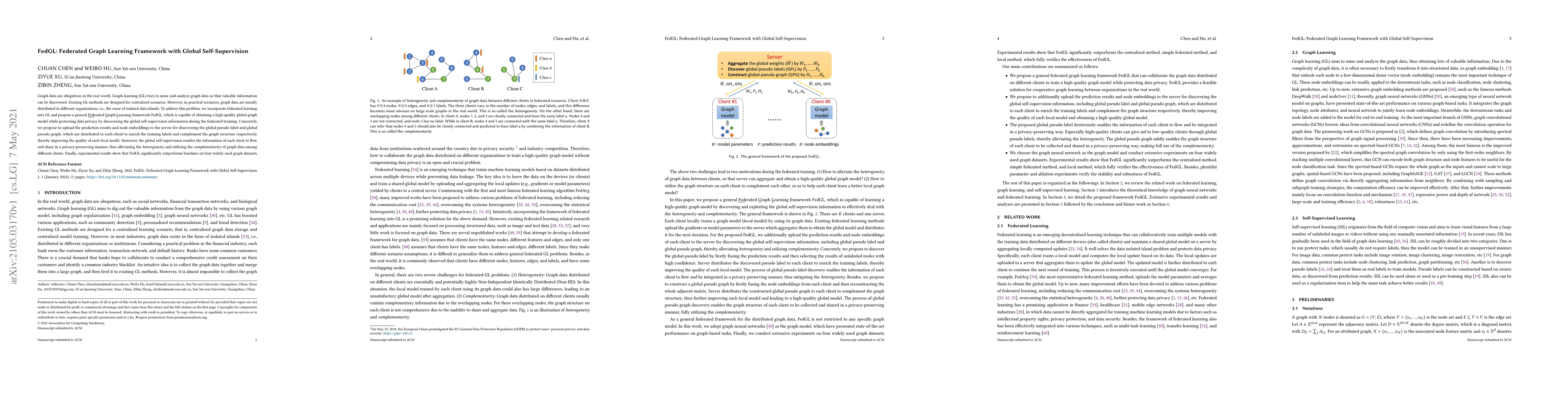 Graph data are ubiquitous in the real world. Graph learning (GL) tries to mine and analyze graph data so that valuable information can be discovered. Existing GL methods are designed for centralized scenarios. However, in practical scenarios, graph data are usually distributed in different organizations, i.e., the curse of isolated data islands. To address this problem, we incorporate federated learning into GL and propose a general Federated Graph Learning framework FedGL, which is capable of obtaining a high-quality global graph model while protecting data privacy by discovering the global self-supervision information during the federated training. Concretely, we propose to upload the prediction results and node embeddings to the server for discovering the global pseudo label and global pseudo graph, which are distributed to each client to enrich the training labels and complement the graph structure respectively, thereby improving the quality of each local model. Moreover, the global self-supervision enables the information of each client to flow and share in a privacy-preserving manner, thus alleviating the heterogeneity and utilizing the complementarity of graph data among different clients. Finally, experimental results show that FedGL significantly outperforms baselines on four widely used graph datasets.