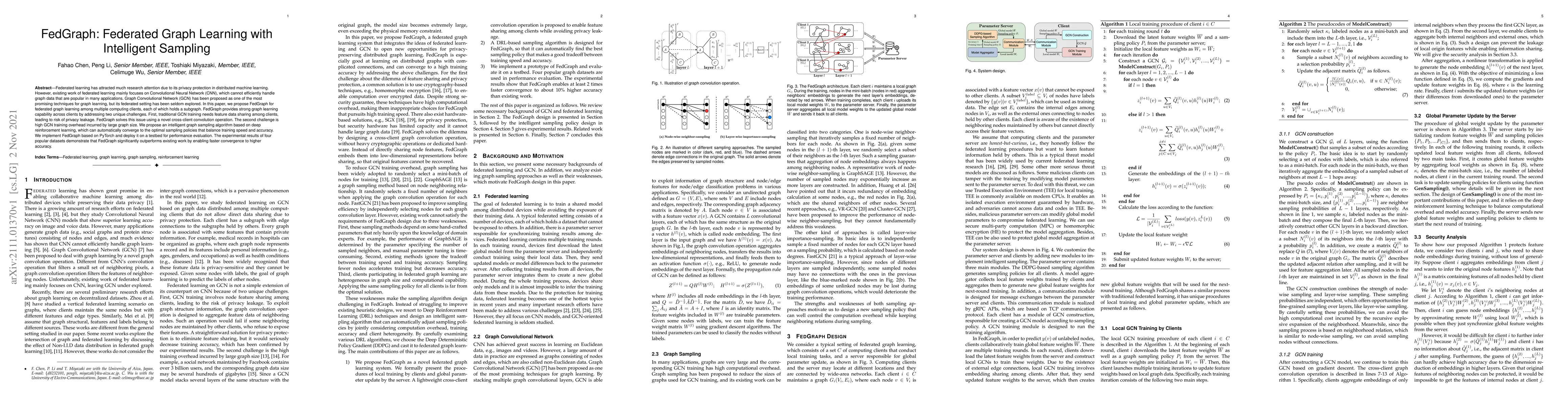 FedGraph proposes a novel federated graph learning framework that addresses privacy concerns and high training overhead in graph convolutional networks. It introduces a cross-client convolution operation and an intelligent sampling algorithm to achieve faster convergence and higher accuracy across distributed clients.