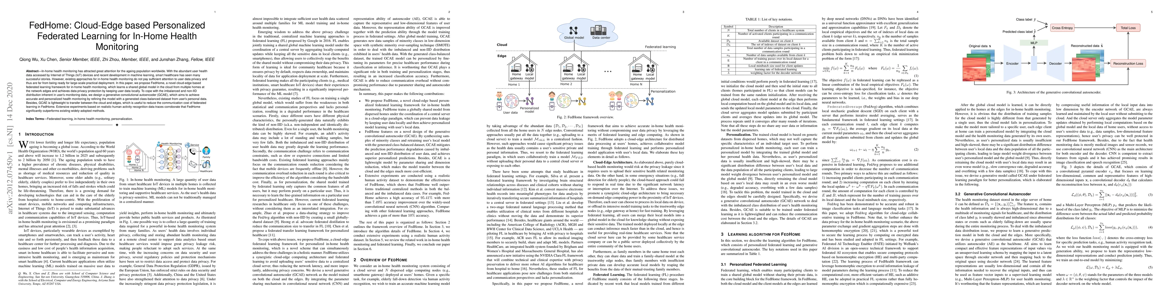 FedHome introduces a cloud-edge federated learning framework for personalized in-home health monitoring, ensuring data privacy by keeping user data locally. It employs a generative convolutional autoencoder to handle data imbalance and non-IID distribution, achieving superior performance in human activity recognition.