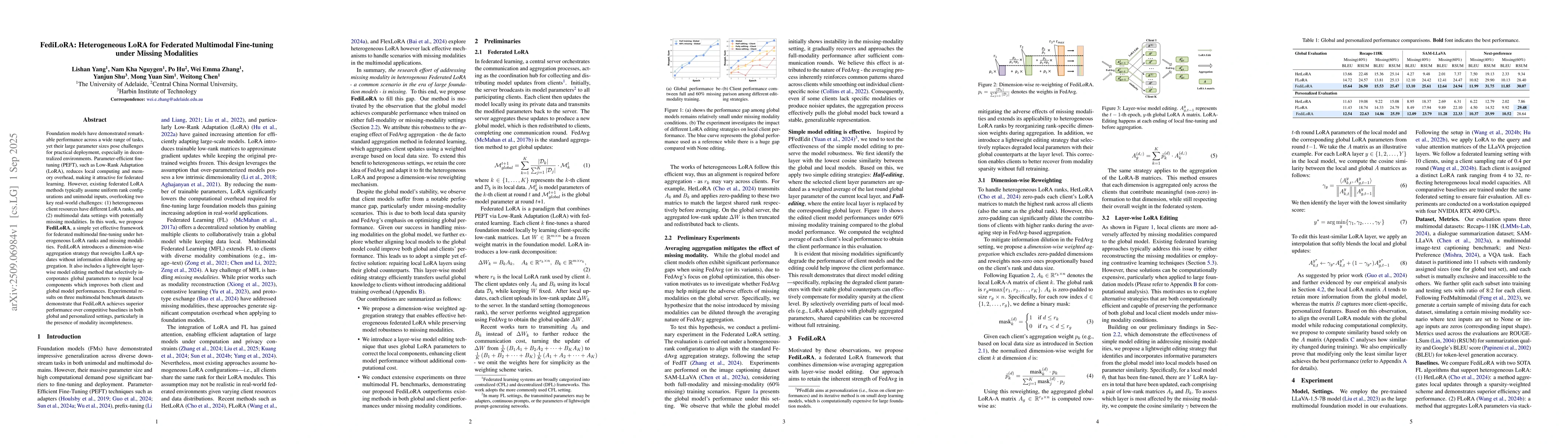 Foundation models have demonstrated remarkable performance across a wide range of tasks, yet their large parameter sizes pose challenges for practical deployment, especially in decentralized environments. Parameter-efficient fine-tuning (PEFT), such as Low-Rank Adaptation (LoRA), reduces local computing and memory overhead, making it attractive for federated learning. However, existing federated LoRA methods typically assume uniform rank configurations and unimodal inputs, overlooking two key real-world challenges: (1) heterogeneous client resources have different LoRA ranks, and (2) multimodal data settings with potentially missing modalities. In this work, we propose FediLoRA, a simple yet effective framework for federated multimodal fine-tuning under heterogeneous LoRA ranks and missing modalities. FediLoRA introduces a dimension-wise aggregation strategy that reweights LoRA updates without information dilution during aggregation. It also includes a lightweight layer-wise model editing method that selectively incorporates global parameters to repair local components which improves both client and global model performances. Experimental results on three multimodal benchmark datasets demonstrate that FediLoRA achieves superior performance over competitive baselines in both global and personalized settings, particularly in the presence of modality incompleteness.
