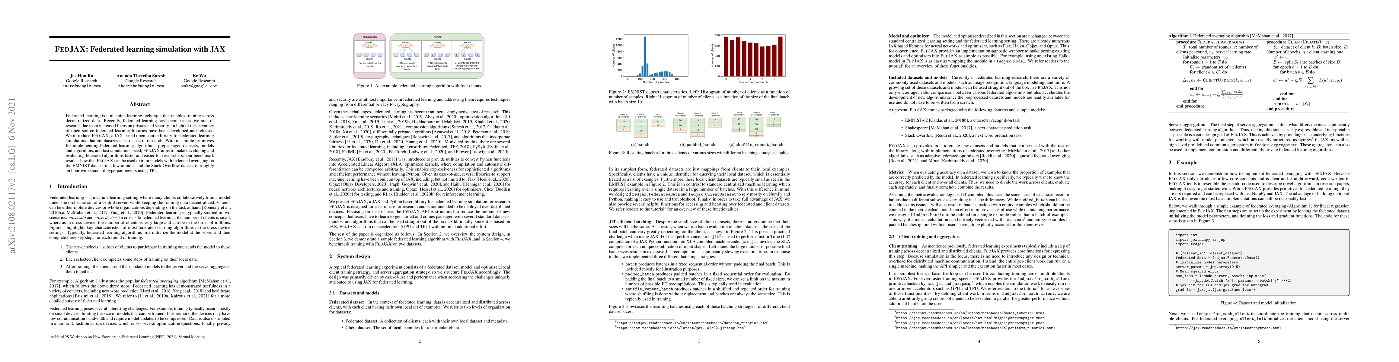 FedJAX is a JAX-based open source library for federated learning simulations, designed to simplify research by providing easy-to-use primitives, prepackaged datasets, and fast simulation speeds. Benchmark results demonstrate its efficiency in training models on various datasets within minutes to an hour.
