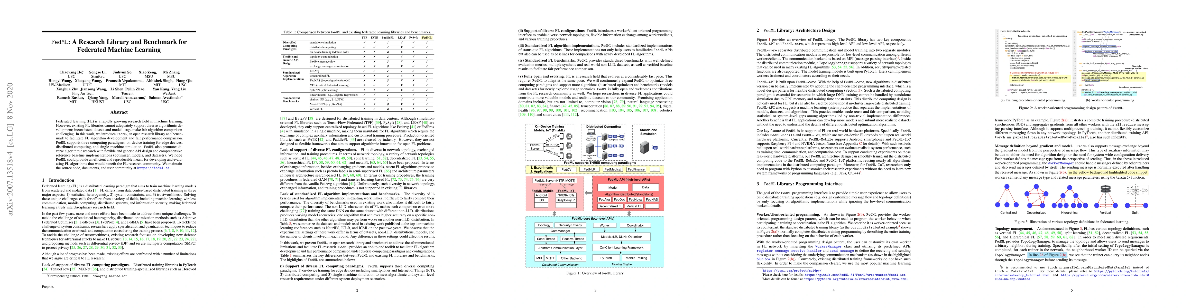 FedML is an open research library and benchmark designed to support diverse federated machine learning (FL) algorithmic development and enable fair performance comparisons. It offers three computing paradigms and provides flexible APIs, comprehensive baseline implementations, and a user community to facilitate FL research.