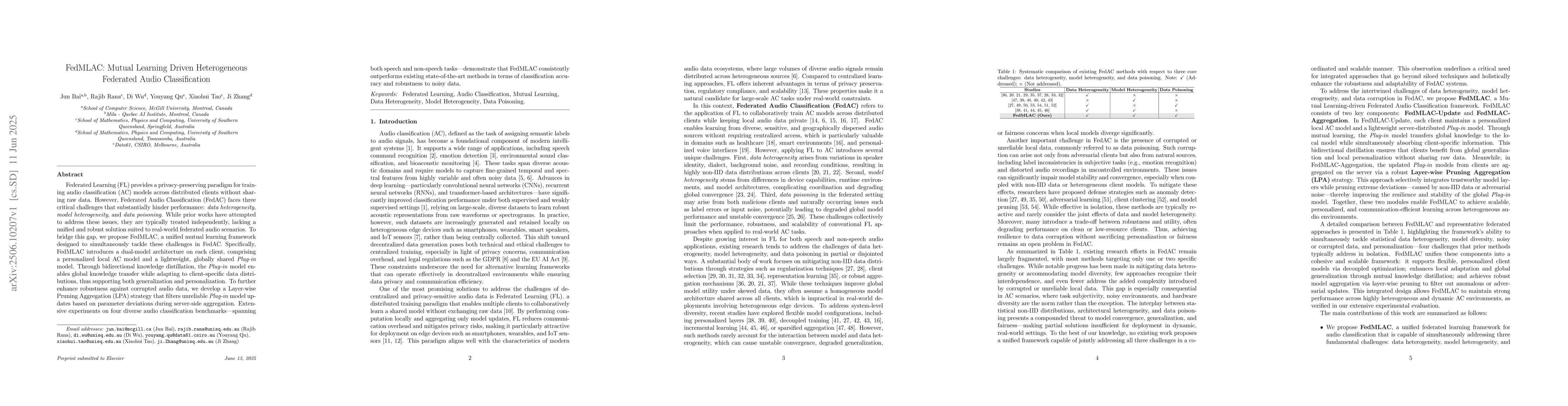 FedMLAC proposes a unified framework to tackle data heterogeneity, model heterogeneity, and data poisoning in Federated Audio Classification, achieving consistent high accuracy and robustness in audio classification tasks.