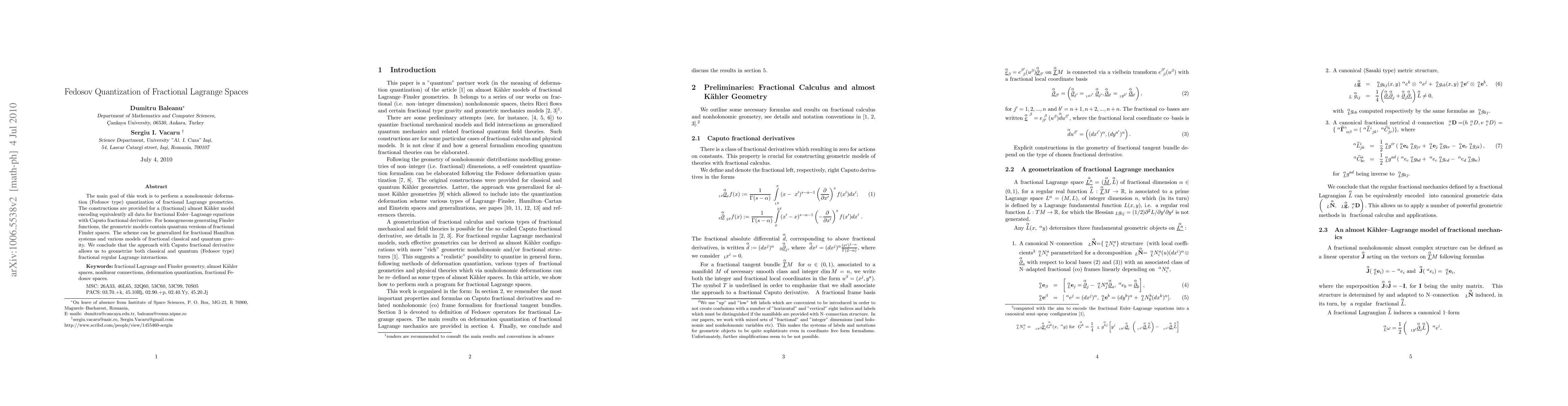 The main goal of this work is to perform a nonolonomic deformation (Fedosov type) quantization of fractional Lagrange geometries. The constructions are provided for a (fractional) almost Kahler model encoding equivalently all data for fractional Euler-Lagrange equations with Caputo fractional derivative. For homogeneous generating Finsler functions, the geometric models contain quantum versions of fractional Finsler spaces. The scheme can be generalized for fractional Hamilton systems and various models of fractional classical and quantum gravity. We conclude that the approach with Caputo fractional derivative allows us to geometrize both classical and quantum (Fedosov type) fractional regular Lagrange interactions.