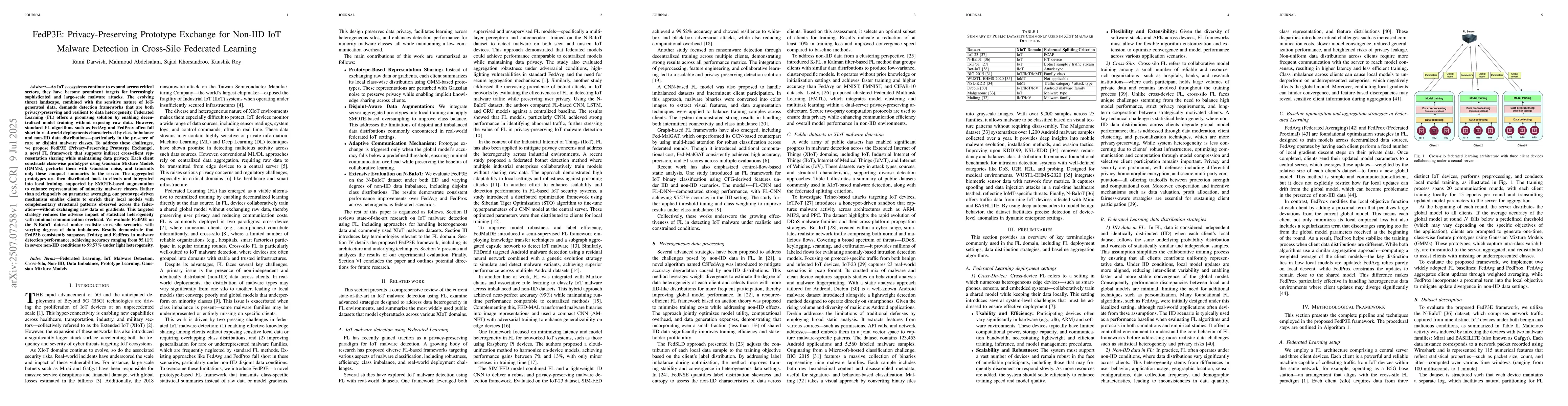 As IoT ecosystems continue to expand across critical sectors, they have become prominent targets for increasingly sophisticated and large-scale malware attacks. The evolving threat landscape, combined with the sensitive nature of IoT-generated data, demands detection frameworks that are both privacy-preserving and resilient to data heterogeneity. Federated Learning (FL) offers a promising solution by enabling decentralized model training without exposing raw data. However, standard FL algorithms such as FedAvg and FedProx often fall short in real-world deployments characterized by class imbalance and non-IID data distributions -- particularly in the presence of rare or disjoint malware classes. To address these challenges, we propose FedP3E (Privacy-Preserving Prototype Exchange), a novel FL framework that supports indirect cross-client representation sharing while maintaining data privacy. Each client constructs class-wise prototypes using Gaussian Mixture Models (GMMs), perturbs them with Gaussian noise, and transmits only these compact summaries to the server. The aggregated prototypes are then distributed back to clients and integrated into local training, supported by SMOTE-based augmentation to enhance representation of minority malware classes. Rather than relying solely on parameter averaging, our prototype-driven mechanism enables clients to enrich their local models with complementary structural patterns observed across the federation -- without exchanging raw data or gradients. This targeted strategy reduces the adverse impact of statistical heterogeneity with minimal communication overhead. We evaluate FedP3E on the N-BaIoT dataset under realistic cross-silo scenarios with varying degrees of data imbalance.