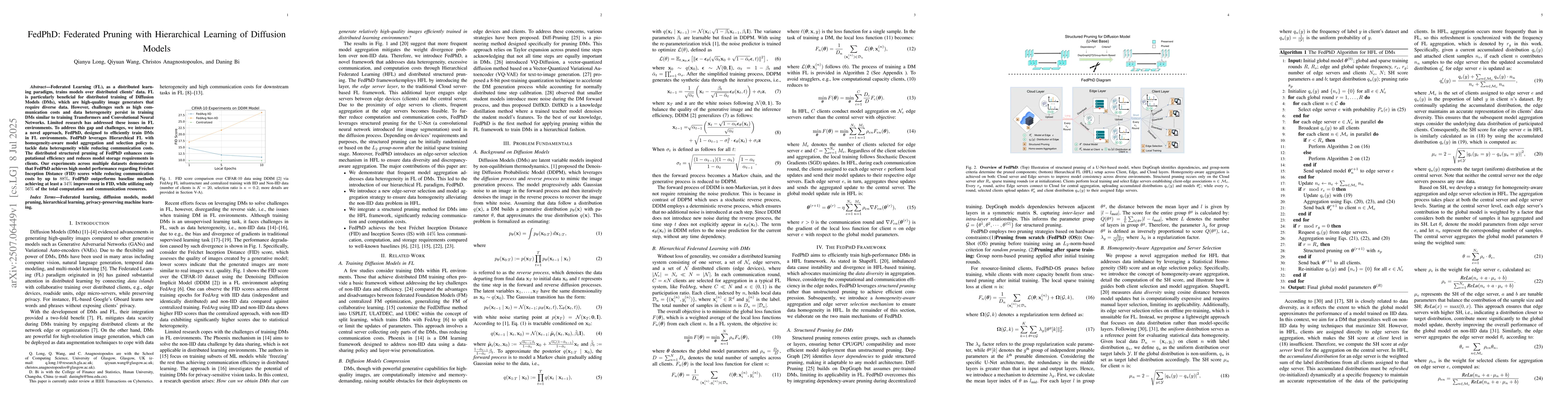 Federated Learning (FL), as a distributed learning paradigm, trains models over distributed clients' data. FL is particularly beneficial for distributed training of Diffusion Models (DMs), which are high-quality image generators that require diverse data. However, challenges such as high communication costs and data heterogeneity persist in training DMs similar to training Transformers and Convolutional Neural Networks. Limited research has addressed these issues in FL environments. To address this gap and challenges, we introduce a novel approach, FedPhD, designed to efficiently train DMs in FL environments. FedPhD leverages Hierarchical FL with homogeneity-aware model aggregation and selection policy to tackle data heterogeneity while reducing communication costs. The distributed structured pruning of FedPhD enhances computational efficiency and reduces model storage requirements in clients. Our experiments across multiple datasets demonstrate that FedPhD achieves high model performance regarding Fr\'echet Inception Distance (FID) scores while reducing communication costs by up to $88\%$. FedPhD outperforms baseline methods achieving at least a $34\%$ improvement in FID, while utilizing only $56\%$ of the total computation and communication resources.