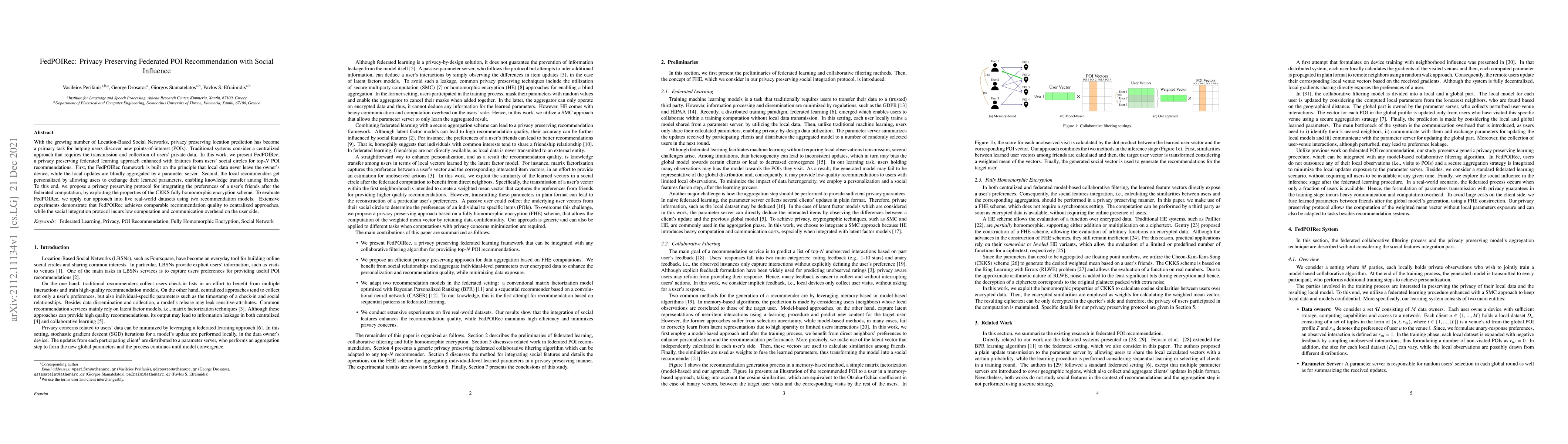 FedPOIRec introduces a privacy-preserving federated learning framework for location-based POI recommendations that leverages users' social circles without compromising data privacy. The approach uses homomorphic encryption for secure parameter sharing and achieves comparable recommendation quality with minimal overhead.