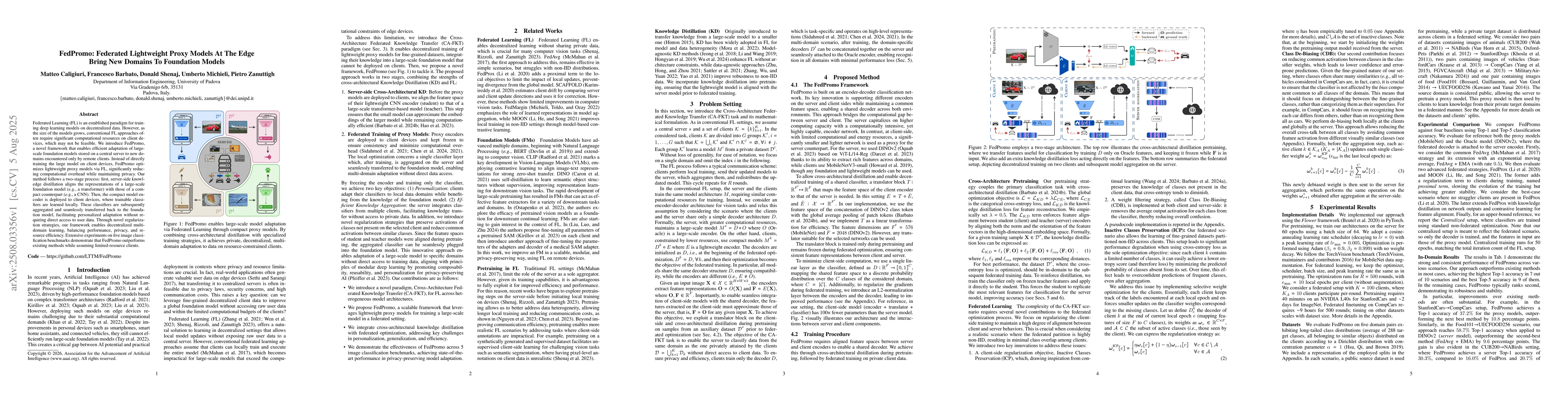 FedPromo is a novel federated learning framework that adapts large foundation models to new domains using lightweight proxy models. It distills knowledge from the large model onto a compact model, deploys the compact model to clients for local classifier training, and aggregates these classifiers back to the foundation model, all while preserving privacy and reducing computational overhead.