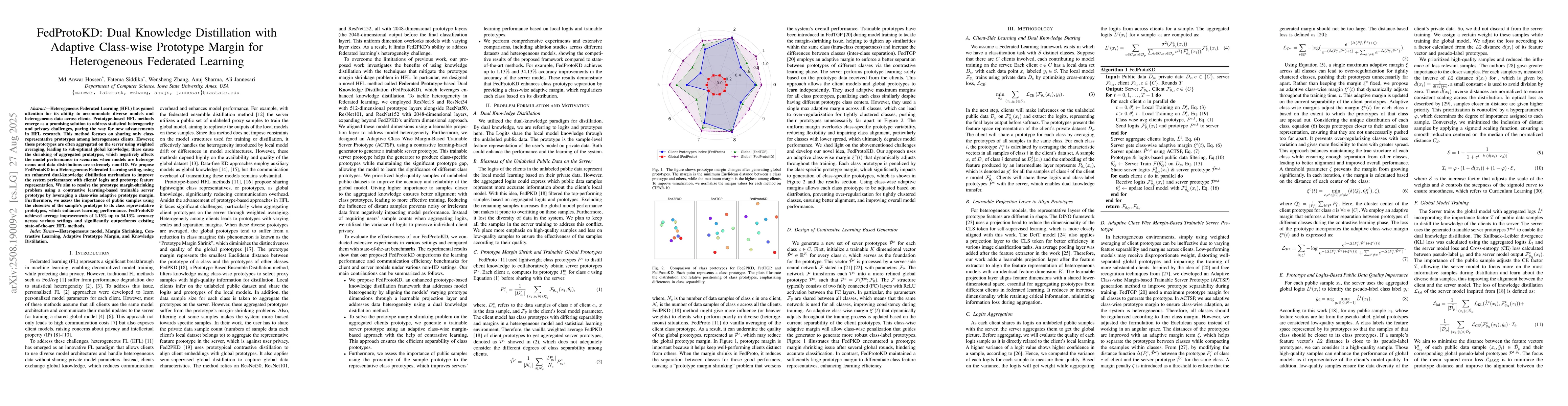 Heterogeneous Federated Learning (HFL) has gained attention for its ability to accommodate diverse models and heterogeneous data across clients. Prototype-based HFL methods emerge as a promising solution to address statistical heterogeneity and privacy challenges, paving the way for new advancements in HFL research. This method focuses on sharing only class-representative prototypes among heterogeneous clients. However, these prototypes are often aggregated on the server using weighted averaging, leading to sub-optimal global knowledge; these cause the shrinking of aggregated prototypes, which negatively affects the model performance in scenarios when models are heterogeneous and data distributions are extremely non-IID. We propose FedProtoKD in a Heterogeneous Federated Learning setting, using an enhanced dual-knowledge distillation mechanism to improve the system performance with clients' logits and prototype feature representation. We aim to resolve the prototype margin-shrinking problem using a contrastive learning-based trainable server prototype by leveraging a class-wise adaptive prototype margin. Furthermore, we assess the importance of public samples using the closeness of the sample's prototype to its class representative prototypes, which enhances learning performance. FedProtoKD achieved average improvements of 1.13% up to 34.13% accuracy across various settings and significantly outperforms existing state-of-the-art HFL methods.