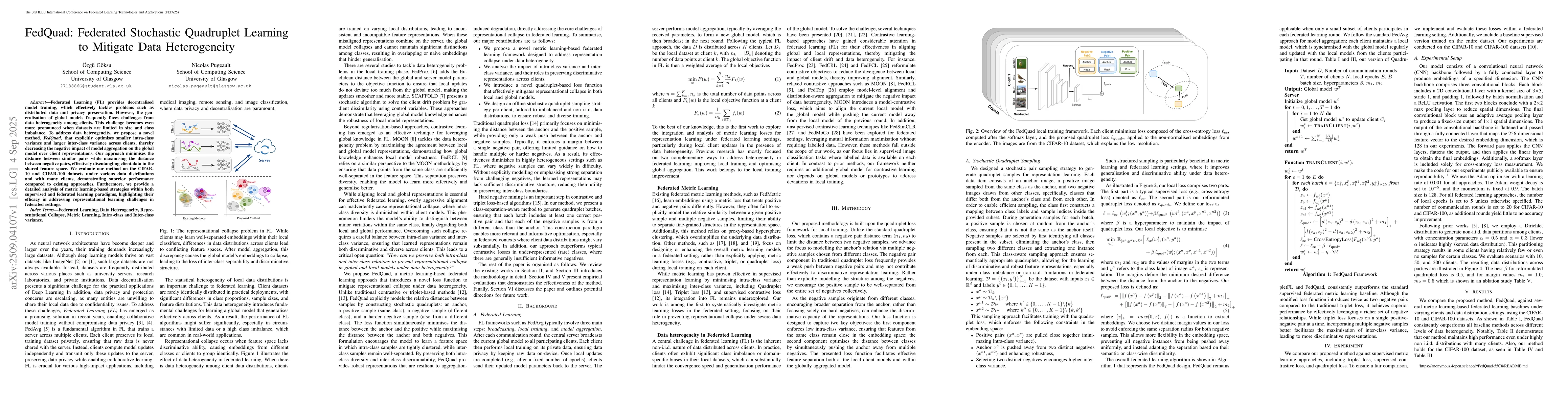 Federated Learning (FL) provides decentralised model training, which effectively tackles problems such as distributed data and privacy preservation. However, the generalisation of global models frequently faces challenges from data heterogeneity among clients. This challenge becomes even more pronounced when datasets are limited in size and class imbalance. To address data heterogeneity, we propose a novel method, \textit{FedQuad}, that explicitly optimises smaller intra-class variance and larger inter-class variance across clients, thereby decreasing the negative impact of model aggregation on the global model over client representations. Our approach minimises the distance between similar pairs while maximising the distance between negative pairs, effectively disentangling client data in the shared feature space. We evaluate our method on the CIFAR-10 and CIFAR-100 datasets under various data distributions and with many clients, demonstrating superior performance compared to existing approaches. Furthermore, we provide a detailed analysis of metric learning-based strategies within both supervised and federated learning paradigms, highlighting their efficacy in addressing representational learning challenges in federated settings.