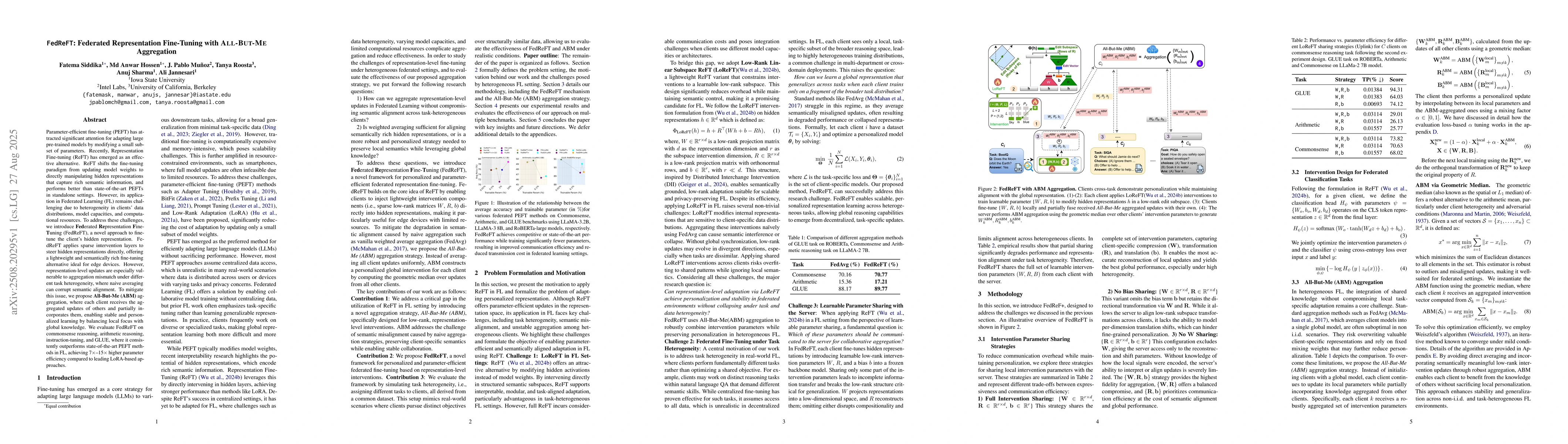 Parameter-efficient fine-tuning (PEFT) has attracted significant attention for adapting large pre-trained models by modifying a small subset of parameters. Recently, Representation Fine-tuning (ReFT) has emerged as an effective alternative. ReFT shifts the fine-tuning paradigm from updating model weights to directly manipulating hidden representations that capture rich semantic information, and performs better than state-of-the-art PEFTs in standalone settings. However, its application in Federated Learning (FL) remains challenging due to heterogeneity in clients' data distributions, model capacities, and computational resources. To address these challenges, we introduce Federated Representation Fine-Tuning (FedReFT), a novel approach to fine-tune the client's hidden representation. FedReFT applies sparse intervention layers to steer hidden representations directly, offering a lightweight and semantically rich fine-tuning alternative ideal for edge devices. However, representation-level updates are especially vulnerable to aggregation mismatch under different task heterogeneity, where naive averaging can corrupt semantic alignment. To mitigate this issue, we propose All-But-Me (ABM) aggregation, where each client receives the aggregated updates of others and partially incorporates them, enabling stable and personalized learning by balancing local focus with global knowledge. We evaluate FedReFT on commonsense reasoning, arithmetic reasoning, instruction-tuning, and GLUE, where it consistently outperforms state-of-the-art PEFT methods in FL, achieving 7x-15x higher parameter efficiency compared to leading LoRA-based approaches.