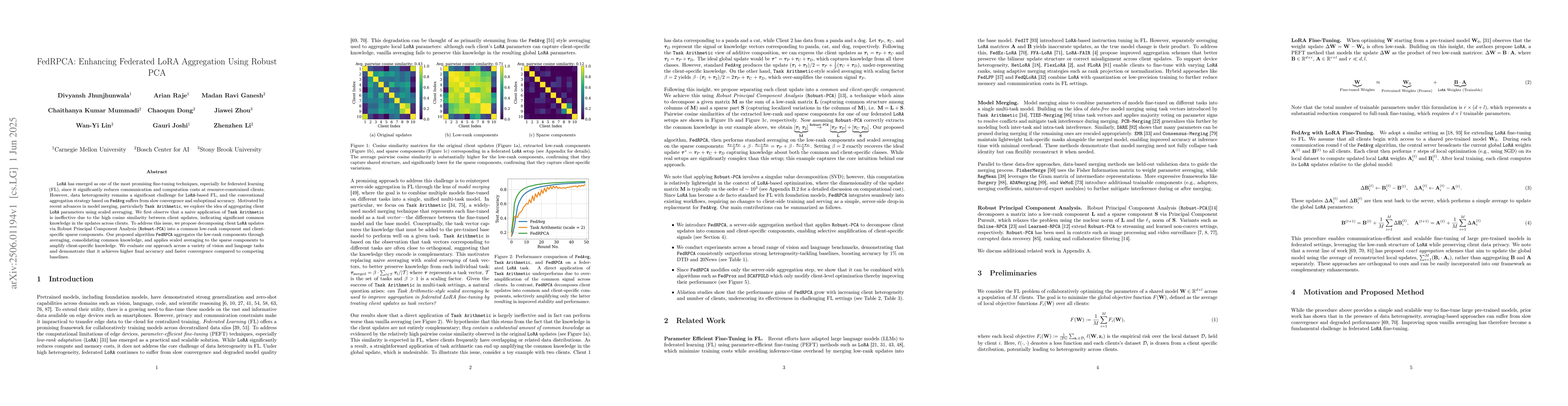 LoRA has emerged as one of the most promising fine-tuning techniques, especially for federated learning (FL), since it significantly reduces communication and computation costs at resource-constrained clients. However, data heterogeneity remains a significant challenge for LoRA-based FL, and the conventional aggregation strategy based on FedAvg suffers from slow convergence and suboptimal accuracy. Motivated by recent advances in model merging, particularly Task Arithmetic, we explore the idea of aggregating client LoRA parameters using scaled averaging. We first observe that a naive application of Task Arithmetic is ineffective due to the high cosine similarity between client updates, indicating significant common knowledge in the updates across clients. To address this issue, we propose decomposing client LoRA updates via Robust Principal Component Analysis (Robust-PCA) into a common low-rank component and client-specific sparse components. Our proposed algorithm FedRPCA aggregates the low-rank components through averaging, consolidating common knowledge, and applies scaled averaging to the sparse components to amplify client-specific knowledge. We evaluate our approach across a variety of vision and language tasks and demonstrate that it achieves higher final accuracy and faster convergence compared to competing baselines.