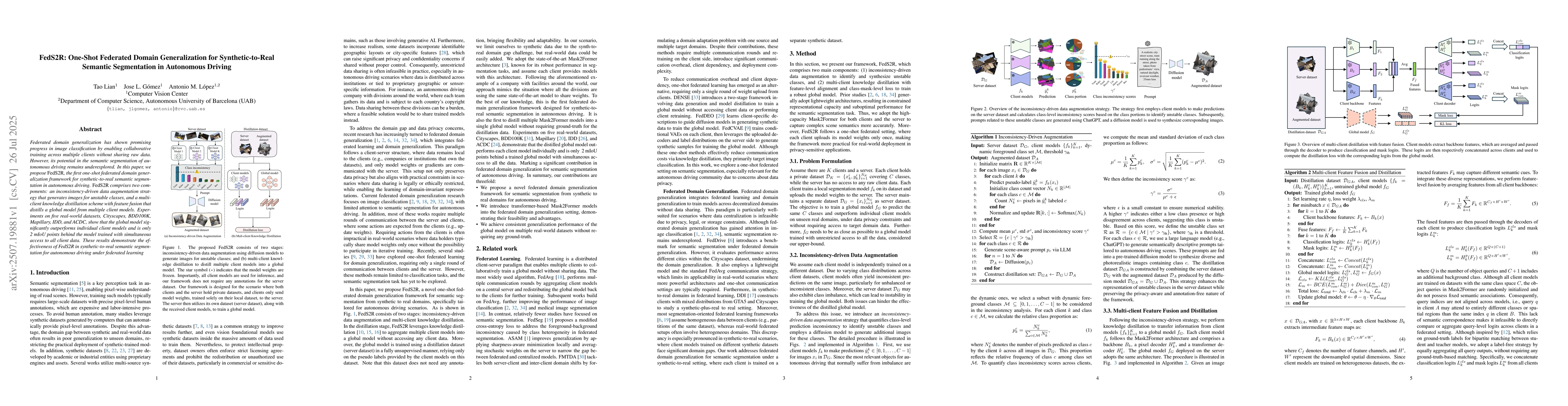 Federated domain generalization has shown promising progress in image classification by enabling collaborative training across multiple clients without sharing raw data. However, its potential in the semantic segmentation of autonomous driving remains underexplored. In this paper, we propose FedS2R, the first one-shot federated domain generalization framework for synthetic-to-real semantic segmentation in autonomous driving. FedS2R comprises two components: an inconsistency-driven data augmentation strategy that generates images for unstable classes, and a multi-client knowledge distillation scheme with feature fusion that distills a global model from multiple client models. Experiments on five real-world datasets, Cityscapes, BDD100K, Mapillary, IDD, and ACDC, show that the global model significantly outperforms individual client models and is only 2 mIoU points behind the model trained with simultaneous access to all client data. These results demonstrate the effectiveness of FedS2R in synthetic-to-real semantic segmentation for autonomous driving under federated learning