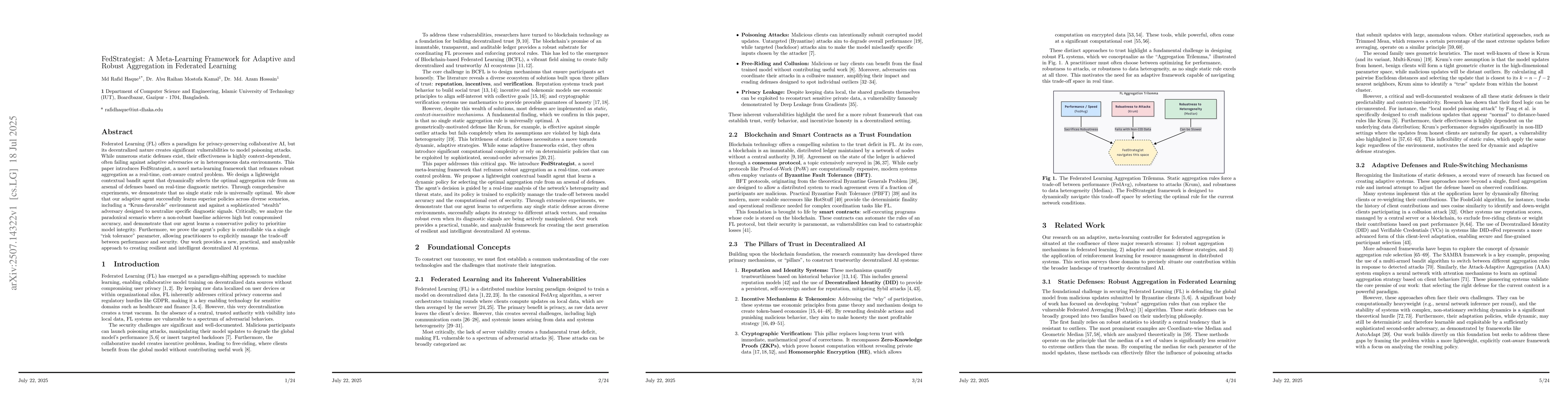Federated Learning (FL) offers a paradigm for privacy-preserving collaborative AI, but its decentralized nature creates significant vulnerabilities to model poisoning attacks. While numerous static defenses exist, their effectiveness is highly context-dependent, often failing against adaptive adversaries or in heterogeneous data environments. This paper introduces FedStrategist, a novel meta-learning framework that reframes robust aggregation as a real-time, cost-aware control problem. We design a lightweight contextual bandit agent that dynamically selects the optimal aggregation rule from an arsenal of defenses based on real-time diagnostic metrics. Through comprehensive experiments, we demonstrate that no single static rule is universally optimal. We show that our adaptive agent successfully learns superior policies across diverse scenarios, including a ``Krum-favorable" environment and against a sophisticated "stealth" adversary designed to neutralize specific diagnostic signals. Critically, we analyze the paradoxical scenario where a non-robust baseline achieves high but compromised accuracy, and demonstrate that our agent learns a conservative policy to prioritize model integrity. Furthermore, we prove the agent's policy is controllable via a single "risk tolerance" parameter, allowing practitioners to explicitly manage the trade-off between performance and security. Our work provides a new, practical, and analyzable approach to creating resilient and intelligent decentralized AI systems.