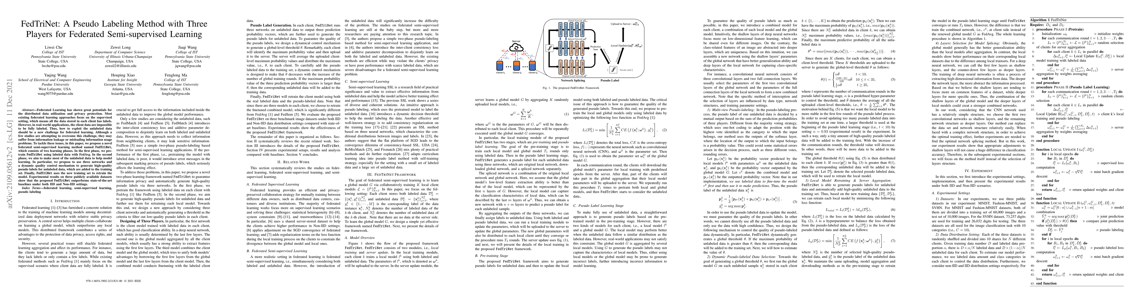 Federated Learning has shown great potentials for the distributed data utilization and privacy protection. Most existing federated learning approaches focus on the supervised setting, which means all the data stored in each client has labels. However, in real-world applications, the client data are impossible to be fully labeled. Thus, how to exploit the unlabeled data should be a new challenge for federated learning. Although a few studies are attempting to overcome this challenge, they may suffer from information leakage or misleading information usage problems. To tackle these issues, in this paper, we propose a novel federated semi-supervised learning method named FedTriNet, which consists of two learning phases. In the first phase, we pre-train FedTriNet using labeled data with FedAvg. In the second phase, we aim to make most of the unlabeled data to help model learning. In particular, we propose to use three networks and a dynamic quality control mechanism to generate high-quality pseudo labels for unlabeled data, which are added to the training set. Finally, FedTriNet uses the new training set to retrain the model. Experimental results on three publicly available datasets show that the proposed FedTriNet outperforms state-of-the-art baselines under both IID and Non-IID settings.