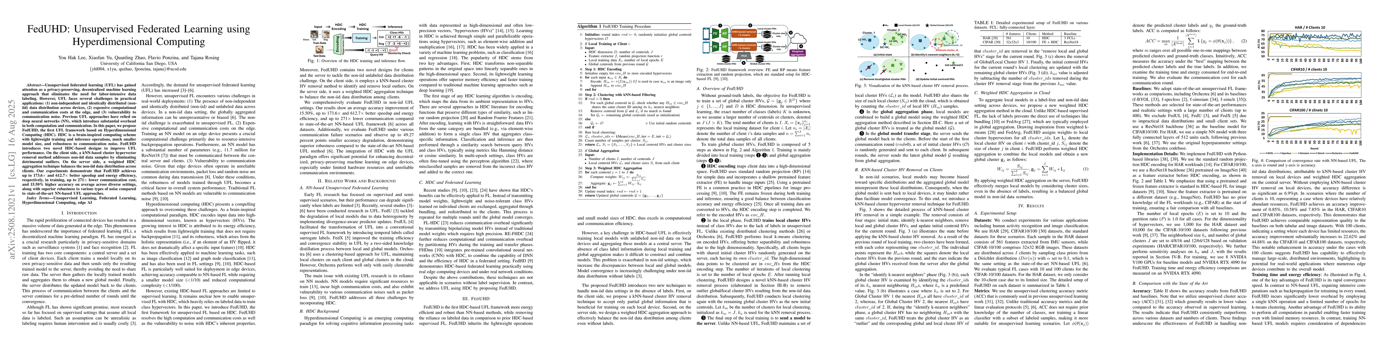 Unsupervised federated learning (UFL) has gained attention as a privacy-preserving, decentralized machine learning approach that eliminates the need for labor-intensive data labeling. However, UFL faces several challenges in practical applications: (1) non-independent and identically distributed (non-iid) data distribution across devices, (2) expensive computational and communication costs at the edge, and (3) vulnerability to communication noise. Previous UFL approaches have relied on deep neural networks (NN), which introduce substantial overhead in both computation and communication. In this paper, we propose FedUHD, the first UFL framework based on Hyperdimensional Computing (HDC). HDC is a brain-inspired computing scheme with lightweight training and inference operations, much smaller model size, and robustness to communication noise. FedUHD introduces two novel HDC-based designs to improve UFL performance. On the client side, a kNN-based cluster hypervector removal method addresses non-iid data samples by eliminating detrimental outliers. On the server side, a weighted HDC aggregation technique balances the non-iid data distribution across clients. Our experiments demonstrate that FedUHD achieves up to 173.6x and 612.7x better speedup and energy efficiency, respectively, in training, up to 271x lower communication cost, and 15.50% higher accuracy on average across diverse settings, along with superior robustness to various types of noise compared to state-of-the-art NN-based UFL approaches.