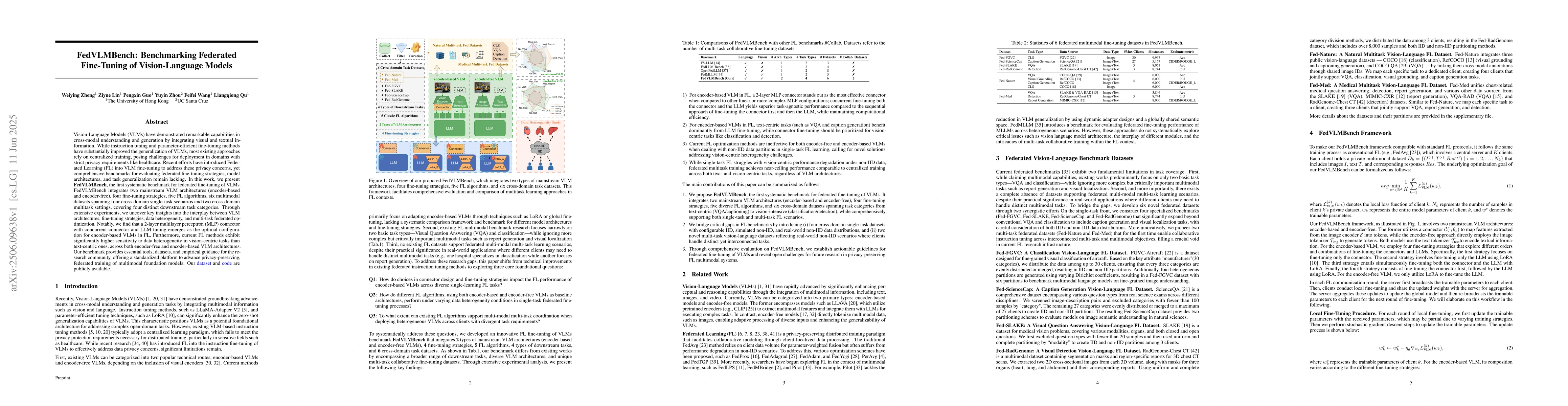 This paper introduces FedVLMBench, a comprehensive benchmark for federated fine-tuning of Vision-Language Models (VLMs), offering insights into optimal configurations and data heterogeneity effects.