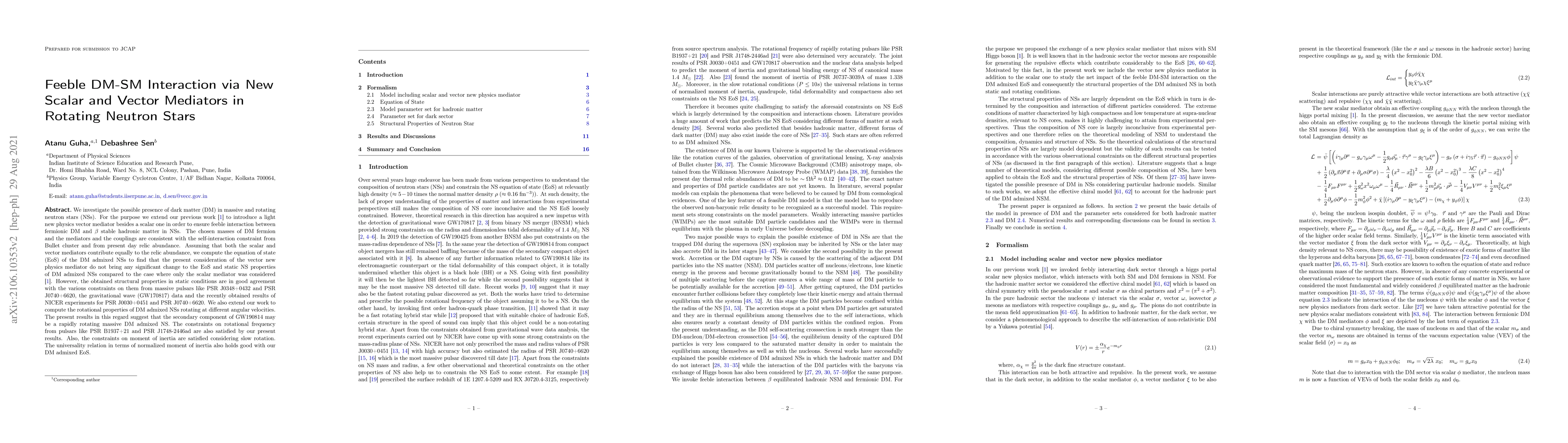 The study extends previous work by introducing a light new physics vector mediator alongside a scalar mediator to ensure feeble interaction between fermionic dark matter and beta-stable hadronic matter in neutron stars. Masses of dark matter fermions, mediators, and couplings are chosen to satisfy constraints from the Bullet Cluster and present-day relic abundance.