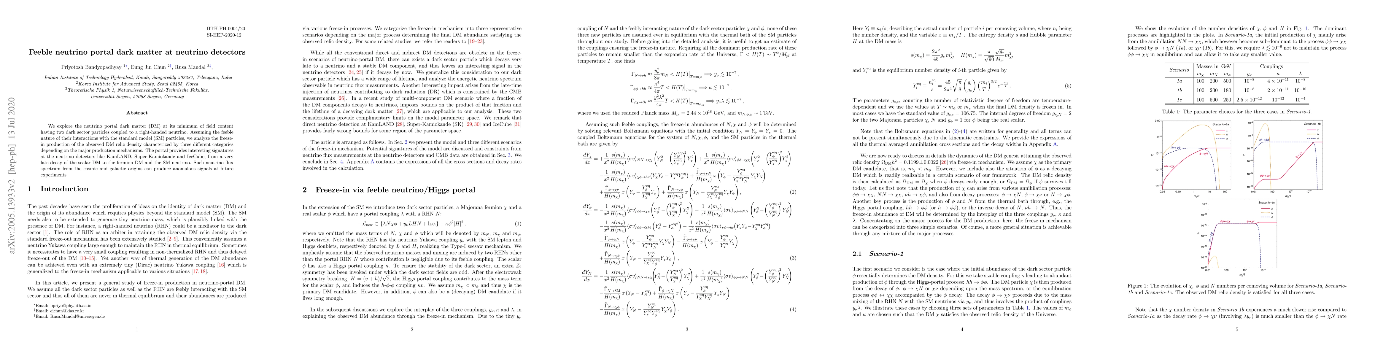 The research explores neutrino portal dark matter with minimal field content, focusing on two dark sector particles coupled to a right-handed neutrino. It analyzes freeze-in production of dark matter relic density in three categories based on production mechanisms, considering feeble interactions with standard model particles.