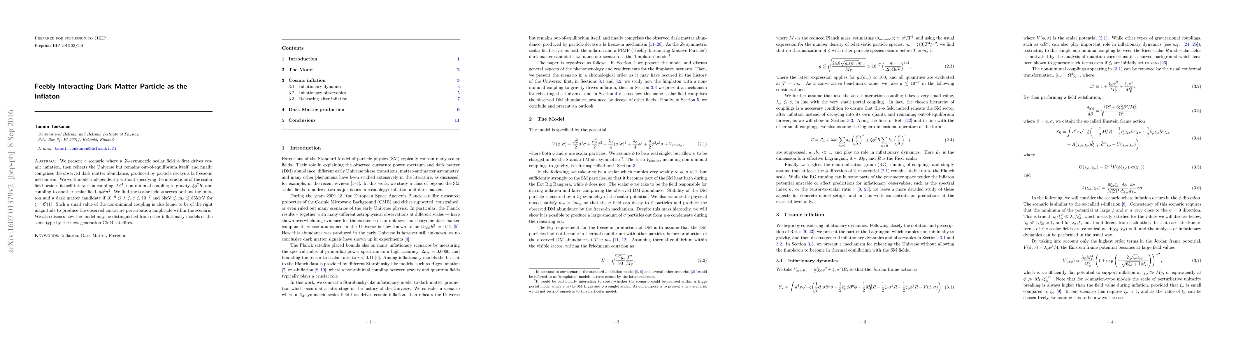 This paper proposes a $Z_2$-symmetric scalar field $\phi$ as the inflaton that drives cosmic inflation and subsequently reheats the Universe, while remaining out-of-equilibrium to become dark matter via a freeze-in mechanism. The model's viability depends on specific coupling values and mass ranges, and it may be distinguishable from other inflationary models by future CMB satellites.