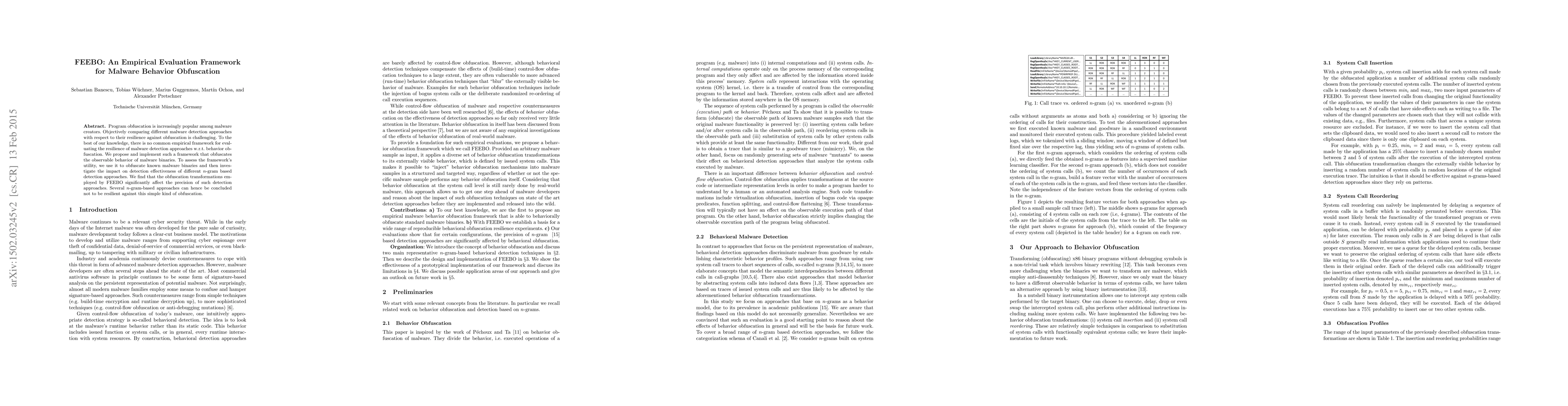 The FEEBO framework evaluates malware detection resilience against behavior obfuscation, revealing that $n$-gram-based detection approaches suffer significantly in precision when faced with obfuscated malware. This highlights the lack of resilience in several detection methods against simple obfuscation techniques.