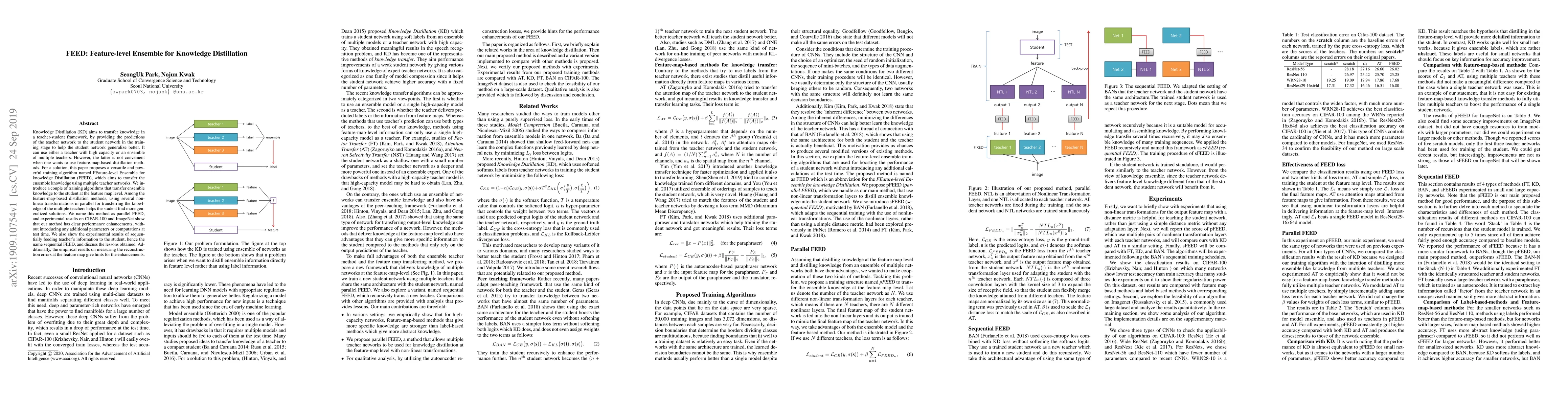 Knowledge Distillation (KD) aims to transfer knowledge in a teacher-student framework, by providing the predictions of the teacher network to the student network in the training stage to help the student network generalize better. It can use either a teacher with high capacity or {an} ensemble of multiple teachers. However, the latter is not convenient when one wants to use feature-map-based distillation methods. For a solution, this paper proposes a versatile and powerful training algorithm named FEature-level Ensemble for knowledge Distillation (FEED), which aims to transfer the ensemble knowledge using multiple teacher networks. We introduce a couple of training algorithms that transfer ensemble knowledge to the student at the feature map level. Among the feature-map-based distillation methods, using several non-linear transformations in parallel for transferring the knowledge of the multiple teacher{s} helps the student find more generalized solutions. We name this method as parallel FEED, andexperimental results on CIFAR-100 and ImageNet show that our method has clear performance enhancements, without introducing any additional parameters or computations at test time. We also show the experimental results of sequentially feeding teacher's information to the student, hence the name sequential FEED, and discuss the lessons obtained. Additionally, the empirical results on measuring the reconstruction errors at the feature map give hints for the enhancements.
