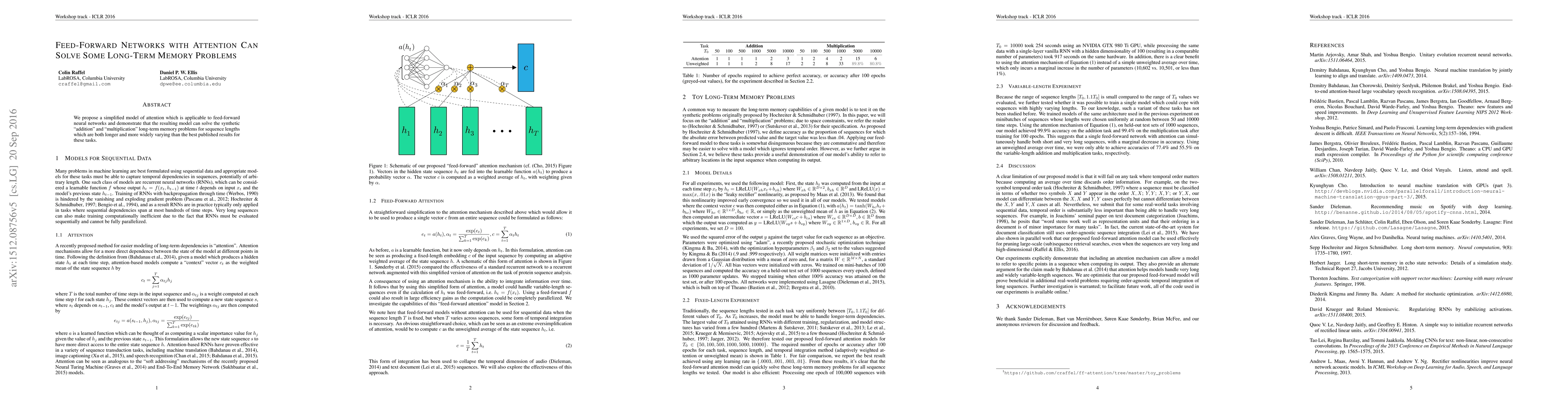 This paper introduces a simplified attention mechanism for feed-forward neural networks, showing that it can effectively solve synthetic long-term memory tasks like "addition" and "multiplication" over longer and more variable sequence lengths than previous methods.