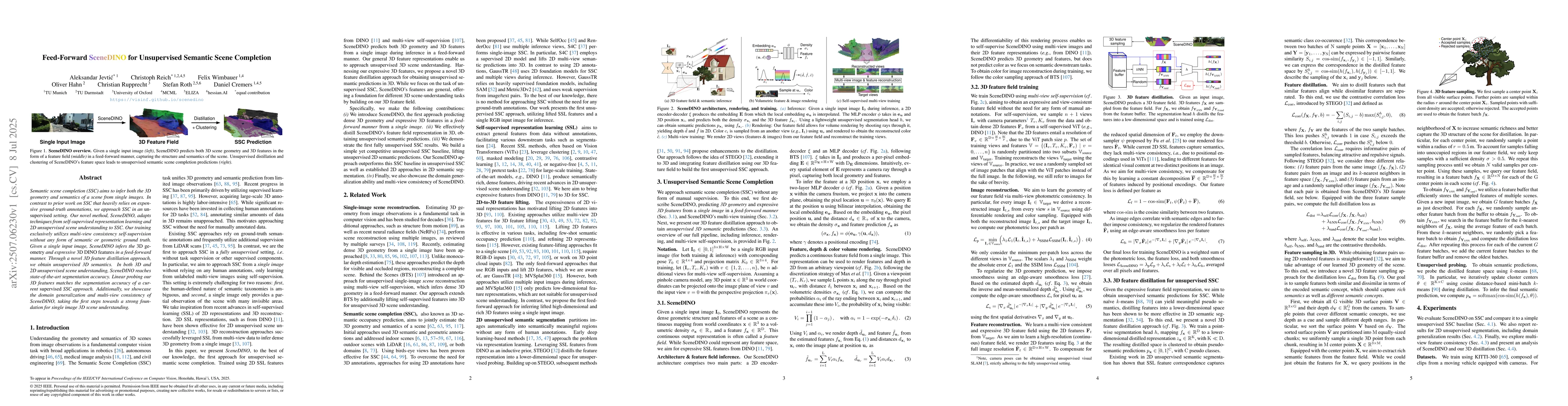 Semantic scene completion (SSC) aims to infer both the 3D geometry and semantics of a scene from single images. In contrast to prior work on SSC that heavily relies on expensive ground-truth annotations, we approach SSC in an unsupervised setting. Our novel method, SceneDINO, adapts techniques from self-supervised representation learning and 2D unsupervised scene understanding to SSC. Our training exclusively utilizes multi-view consistency self-supervision without any form of semantic or geometric ground truth. Given a single input image, SceneDINO infers the 3D geometry and expressive 3D DINO features in a feed-forward manner. Through a novel 3D feature distillation approach, we obtain unsupervised 3D semantics. In both 3D and 2D unsupervised scene understanding, SceneDINO reaches state-of-the-art segmentation accuracy. Linear probing our 3D features matches the segmentation accuracy of a current supervised SSC approach. Additionally, we showcase the domain generalization and multi-view consistency of SceneDINO, taking the first steps towards a strong foundation for single image 3D scene understanding.