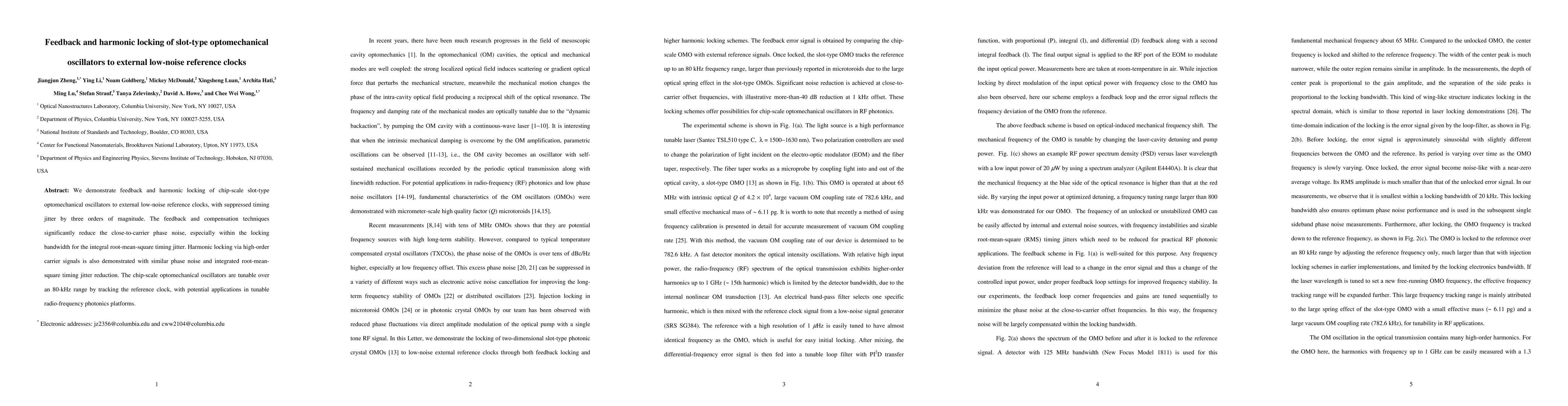 This paper demonstrates feedback and harmonic locking of chip-scale slot-type optomechanical oscillators to external low-noise reference clocks, achieving a three-order-of-magnitude reduction in timing jitter. The techniques also significantly reduce phase noise, with potential applications in tunable radio-frequency photonics platforms.