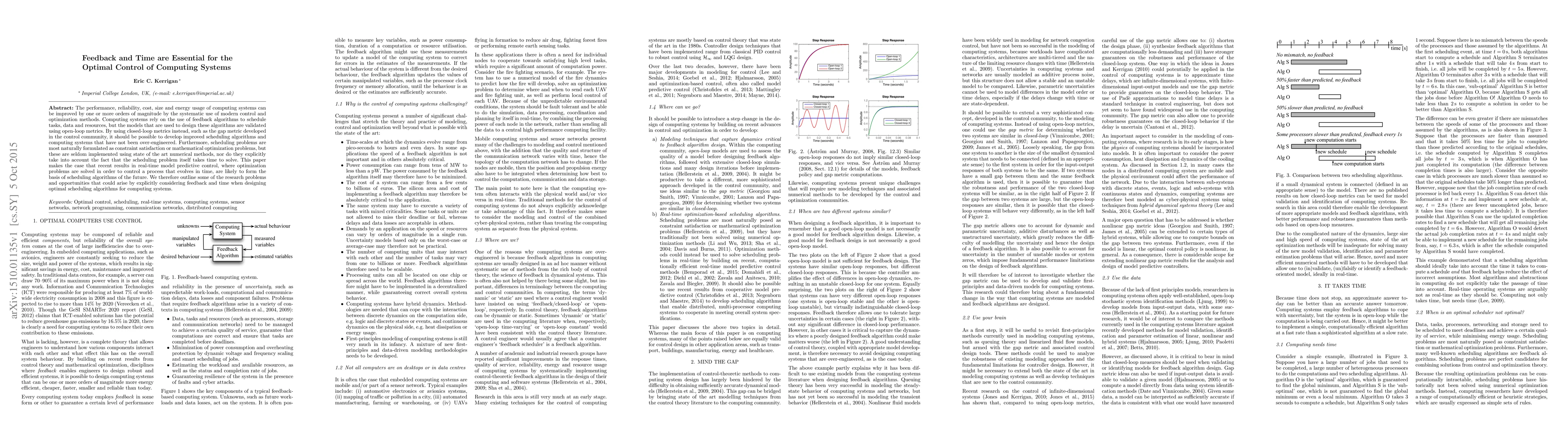 The performance, reliability, cost, size and energy usage of computing systems can be improved by one or more orders of magnitude by the systematic use of modern control and optimization methods. Computing systems rely on the use of feedback algorithms to schedule tasks, data and resources, but the models that are used to design these algorithms are validated using open-loop metrics. By using closed-loop metrics instead, such as the gap metric developed in the control community, it should be possible to develop improved scheduling algorithms and computing systems that have not been over-engineered. Furthermore, scheduling problems are most naturally formulated as constraint satisfaction or mathematical optimization problems, but these are seldom implemented using state of the art numerical methods, nor do they explicitly take into account the fact that the scheduling problem itself takes time to solve. This paper makes the case that recent results in real-time model predictive control, where optimization problems are solved in order to control a process that evolves in time, are likely to form the basis of scheduling algorithms of the future. We therefore outline some of the research problems and opportunities that could arise by explicitly considering feedback and time when designing optimal scheduling algorithms for computing systems.