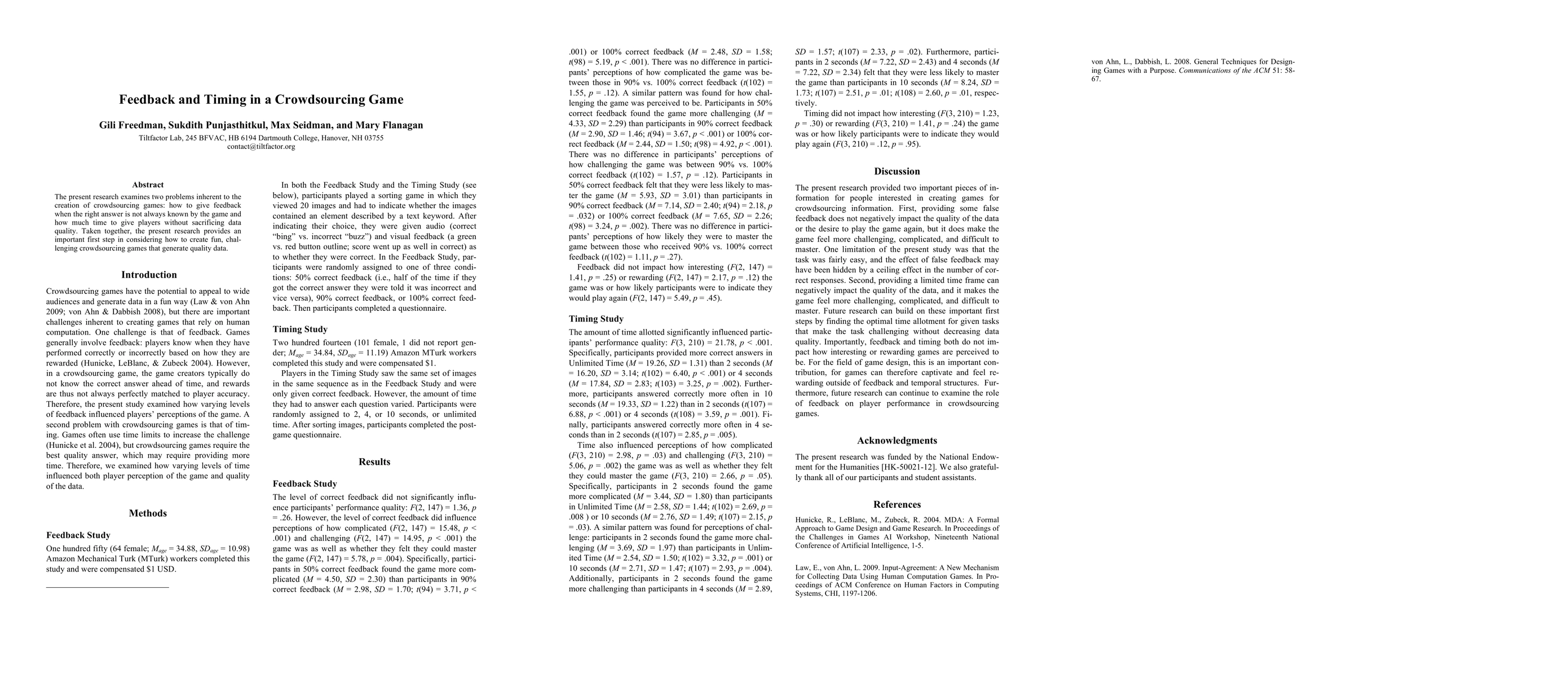 The present research examines two problems inherent to the creation of crowdsourcing games: how to give feedback when the right answer is not always known by the game and how much time to give players without sacrificing data quality. Taken together, the present research provides an important first step in considering how to create fun, challenging crowdsourcing games that generate quality data.