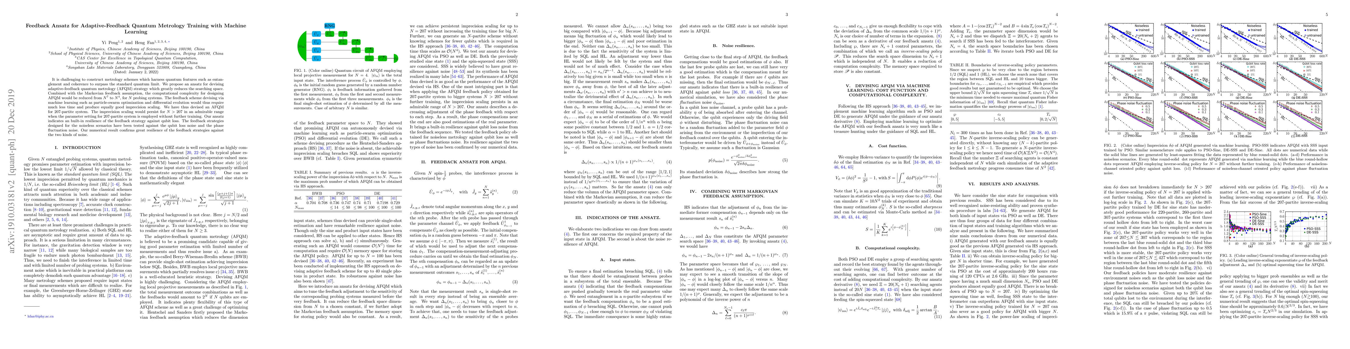 This paper proposes an adaptive-feedback quantum metrology (AFQM) strategy using an ansatz that significantly reduces computational complexity from $N^7$ to $N^4$ for N probing systems. It employs machine learning techniques to devise feedback schemes that maintain precision scaling and resilience against qubit loss and noise.