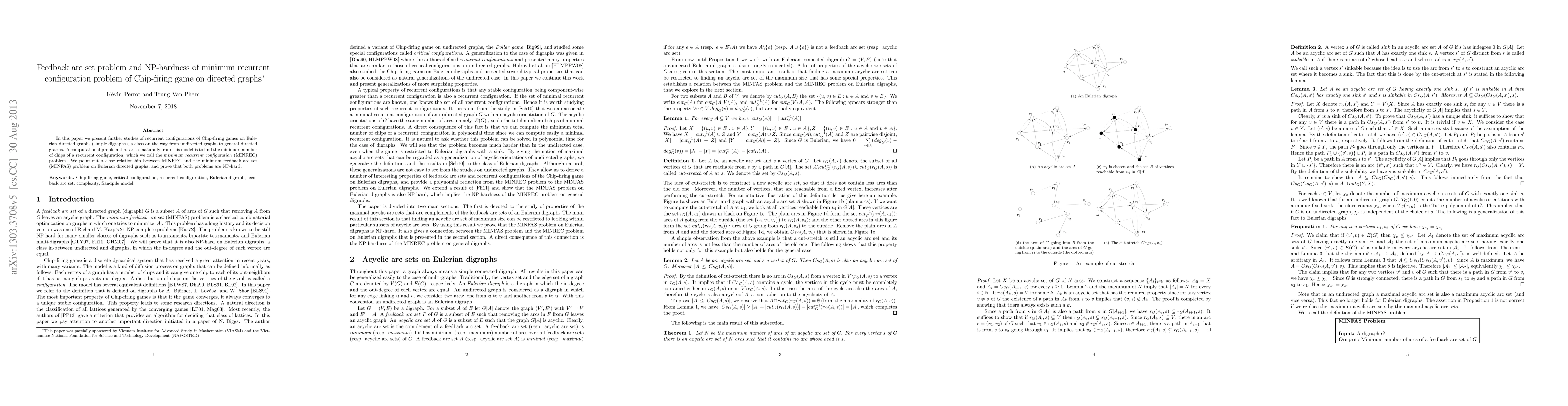 In this paper we present further studies of recurrent configurations of Chip-firing games on Eulerian directed graphs (simple digraphs), a class on the way from undirected graphs to general directed graphs. A computational problem that arises naturally from this model is to find the minimum number of chips of a recurrent configuration, which we call the minimum recurrent configuration (MINREC) problem. We point out a close relationship between MINREC and the minimum feedback arc set (MINFAS) problem on Eulerian directed graphs, and prove that both problems are NP-hard.