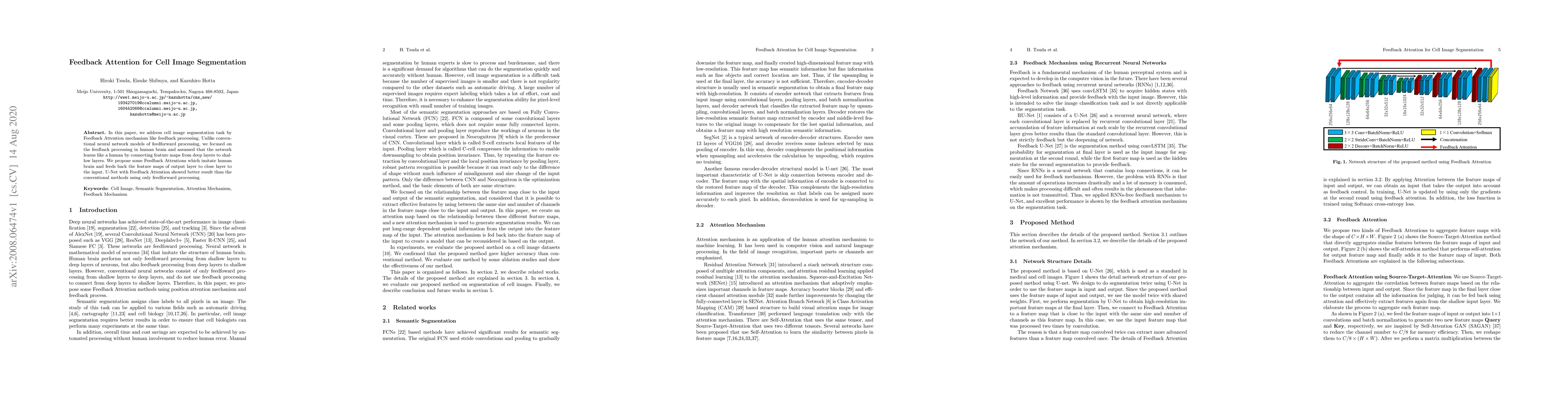 This paper proposes a Feedback Attention mechanism for cell image segmentation, inspired by human brain feedback processing, which connects feature maps across deep and shallow layers. The U-Net with this mechanism outperforms conventional feedforward methods.