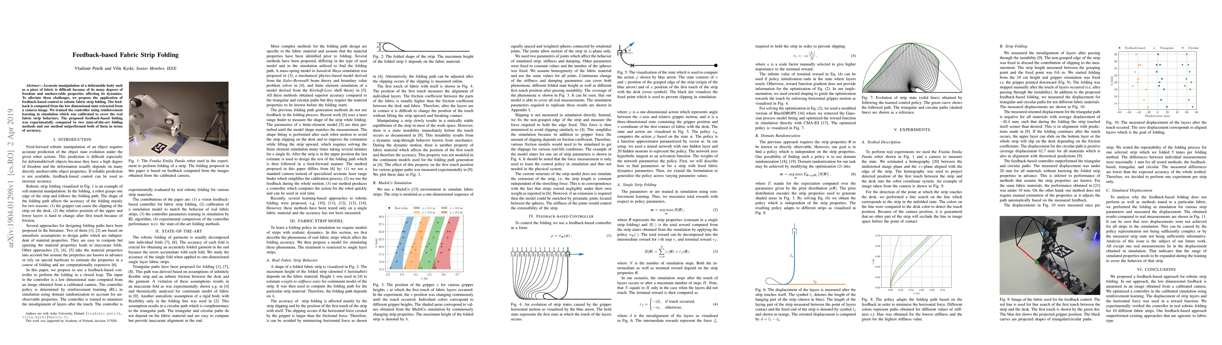 Accurate manipulation of a deformable body such as a piece of fabric is difficult because of its many degrees of freedom and unobservable properties affecting its dynamics. To alleviate these challenges, we propose the application of feedback-based control to robotic fabric strip folding. The feedback is computed from the low dimensional state extracted from a camera image. We trained the controller using reinforcement learning in simulation which was calibrated to cover the real fabric strip behaviors. The proposed feedback-based folding was experimentally compared to two state-of-the-art folding methods and our method outperformed both of them in terms of accuracy.