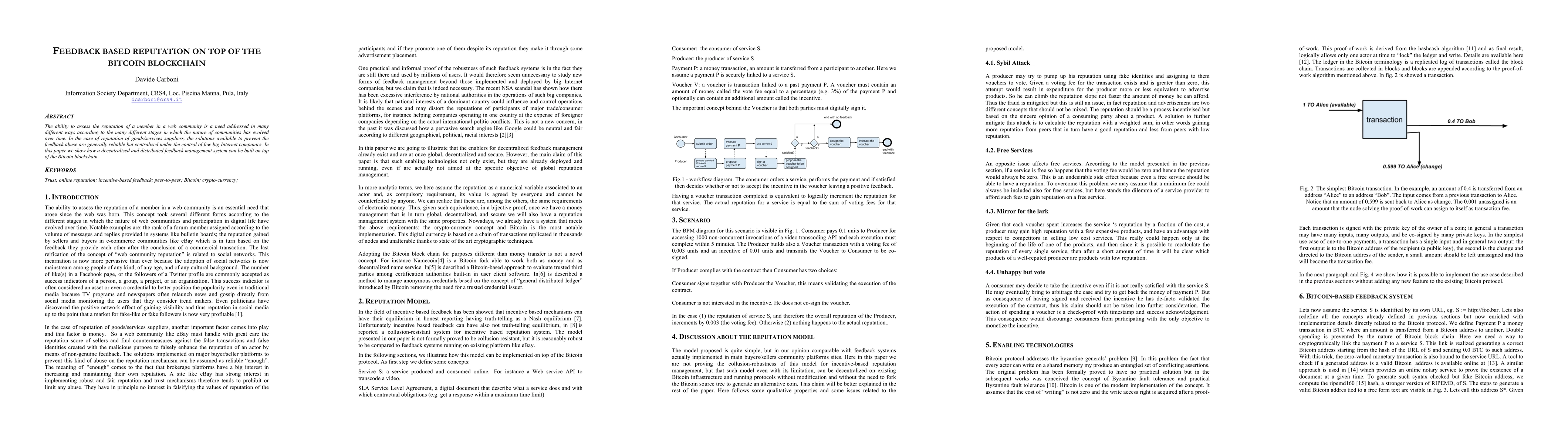 This paper proposes a decentralized feedback-based reputation system built on the Bitcoin blockchain to prevent the abuse of feedback in web communities, offering a more secure and distributed alternative to centralized reputation management systems.
