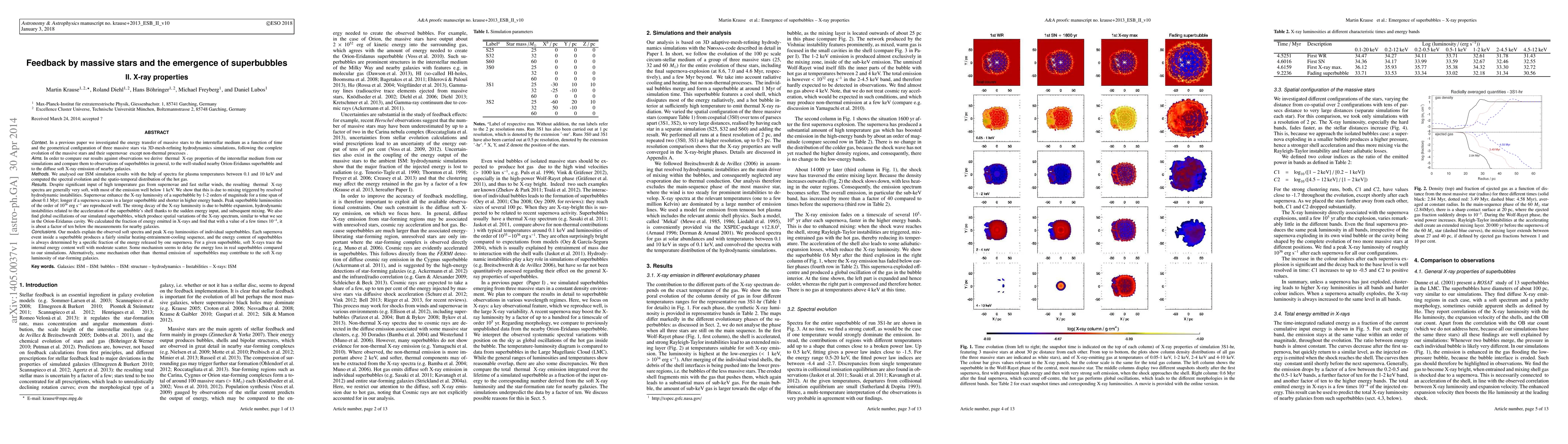 In a previous paper we investigated the energy transfer of massive stars to the interstellar medium as a function of time and the geometrical configuration of three massive stars via 3D-mesh-refining hydrodynamics simulations, following the complete evolution of the massive stars and their supernovae except non-thermal processes . We analysed our ISM simulation results with the help of spectra for plasma temperatures between 0.1 and 10 keV and computed the spectral evolution and the spatio-temporal distribution of the hot gas. Results. Despite significant input of high temperature gas from supernovae and fast stellar winds, the resulting thermal X-ray spectra are generally very soft, with most of the emission well below 1 keV. We show that this is due to mixing triggered by resolved hydrodynamic instabilities. Supernovae enhance the X-ray luminosity of a superbubble by 1-2 orders of magnitude for a time span of about 0.1 Myr; longer if a supernova occurs in a larger superbubble and shorter in higher energy bands. Peak superbubble luminosities of the order of 10^{36} erg/s are reproduced well. The strong decay of the X-ray luminosity is due to bubble expansion, hydrodynamic instabilities related to the acceleration of the superbubble's shell thanks to the sudden energy input, and subsequent mixing. We also find global oscillations of our simulated superbubbles, which produce spatial variations of the X-ray spectrum, similar to what we see in the Orion-Eridanus cavity. We calculated the fraction of energy emitted in X-rays and find that with a value of a few times 10^{-4}, it is about a factor of ten below the measurements for nearby galaxies.