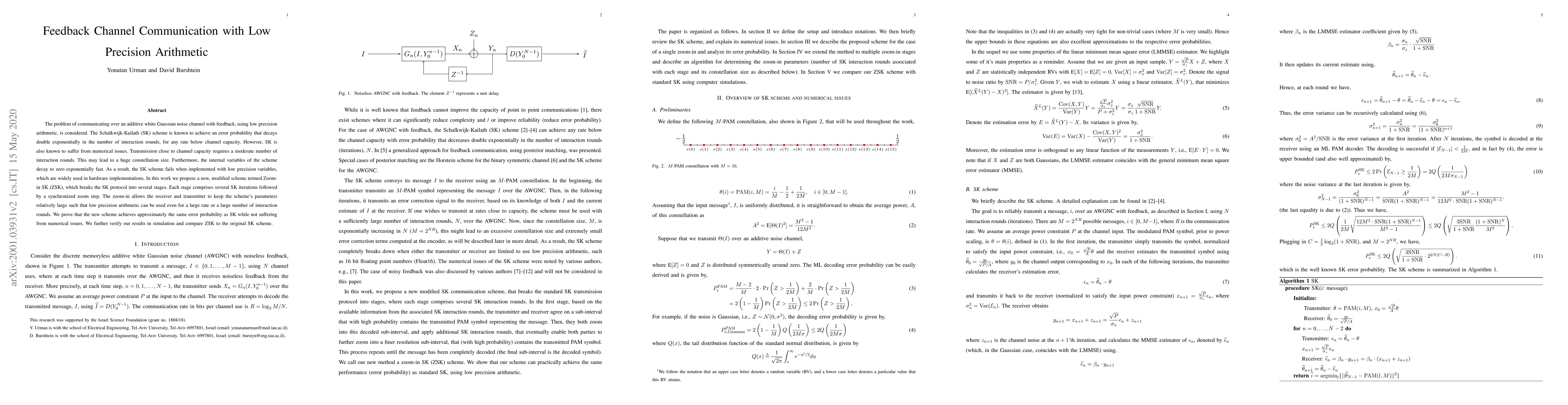 Researchers propose a new scheme, Zoom-in SK (ZSK), that mitigates numerical issues in the Schalkwijk-Kailath protocol for low precision arithmetic, achieving comparable error probability while allowing large constellation sizes and overcoming hardware limitations.