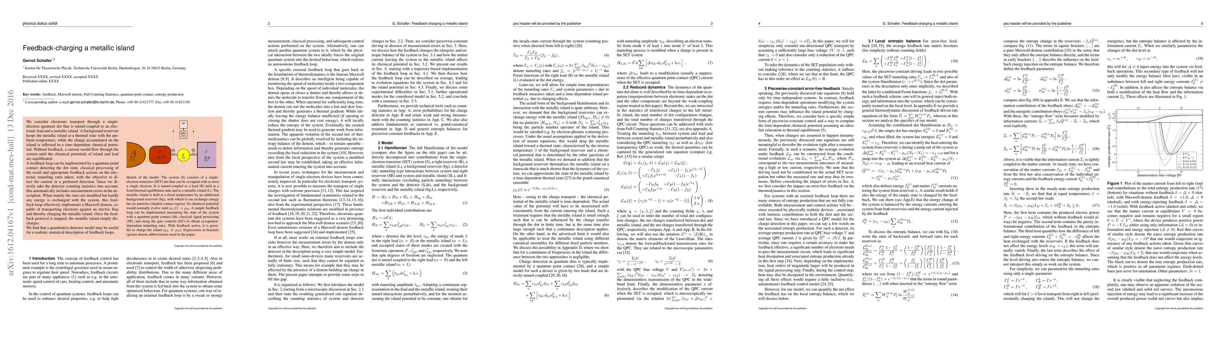 We consider electronic transport through a single-electron quantum dot that is tunnel-coupled to an electronic lead and a metallic island. A background reservoir keeps the metallic island at a thermal state with the ambient temperature, while the charge accumulated on the island is reflected in a time-dependent chemical potential. Without feedback, a current would flow through the system until the chemical potentials of island and lead are equilibrated. A feedback loop can be implemented by a quantum point contact detecting the dot state, classical processing of the result and appropriate feedback actions on the electronic tunneling rates taken, with the objective to direct the current in a preferred direction. Since we directly take the detector counting statistics into account, this automatically includes measurement errors in the description. When mainly the rates are modified but hardly any energy is exchanged with the system, this feedback loop effectively implements a Maxwell demon, capable of transporting electrons against an electric bias and thereby charging the metallic island. Once the feedback protocol is stopped, the metallic island simply discharges. We find that a quantitative detector model may be useful for a realistic statistical description of feedback loops.
