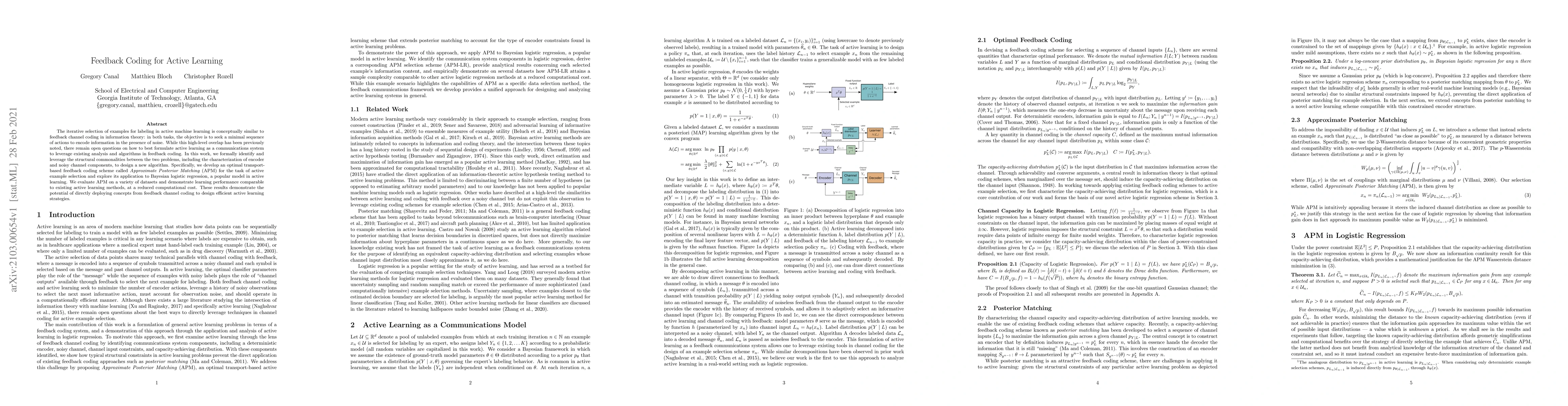 This paper proposes a novel feedback coding scheme called Approximate Posterior Matching (APM) for active learning, leveraging structural commonalities between active learning and information theory. The results show that APM achieves comparable performance to existing methods while reducing computational costs.