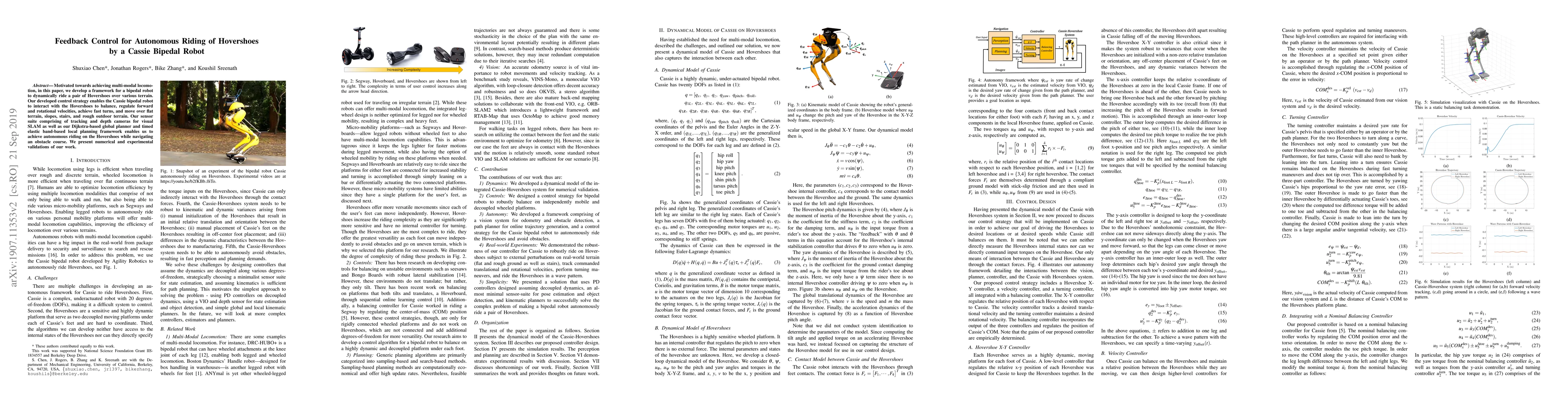 Motivated towards achieving multi-modal locomotion, in this paper, we develop a framework for a bipedal robot to dynamically ride a pair of Hovershoes over various terrain. Our developed control strategy enables the Cassie bipedal robot to interact with the Hovershoes to balance, regulate forward and rotational velocities, achieve fast turns, and move over flat terrain, slopes, stairs, and rough outdoor terrain. Our sensor suite comprising of tracking and depth cameras for visual SLAM as well as our Dijkstra-based global planner and timed elastic band-based local planning framework enables us to achieve autonomous riding on the Hovershoes while navigating an obstacle course. We present numerical and experimental validations of our work.