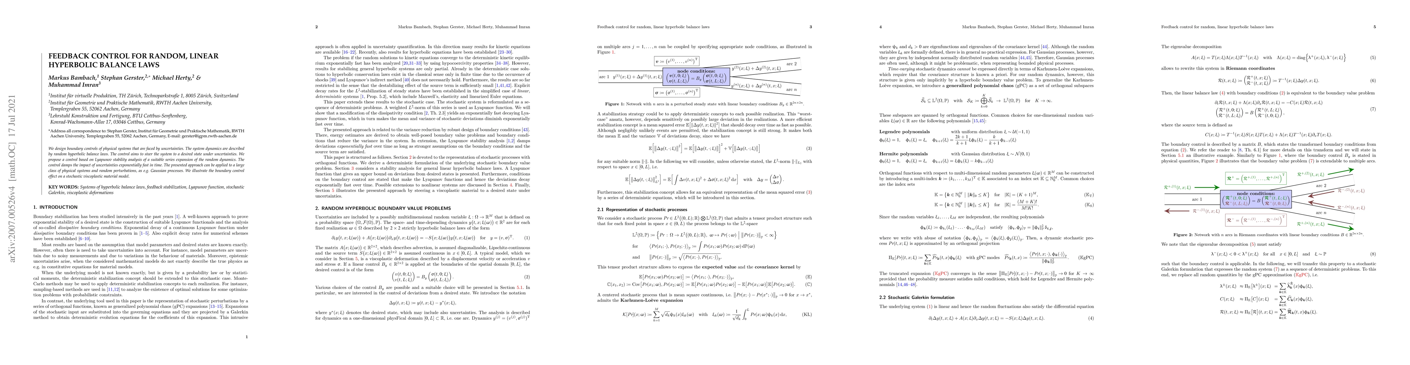 This paper proposes a feedback control method for systems governed by random hyperbolic balance laws, aiming to steer the system to a desired state under uncertainty. The control leverages Lyapunov stability analysis and series expansion to dampen uncertainties exponentially, applicable to various physical systems and random perturbations.