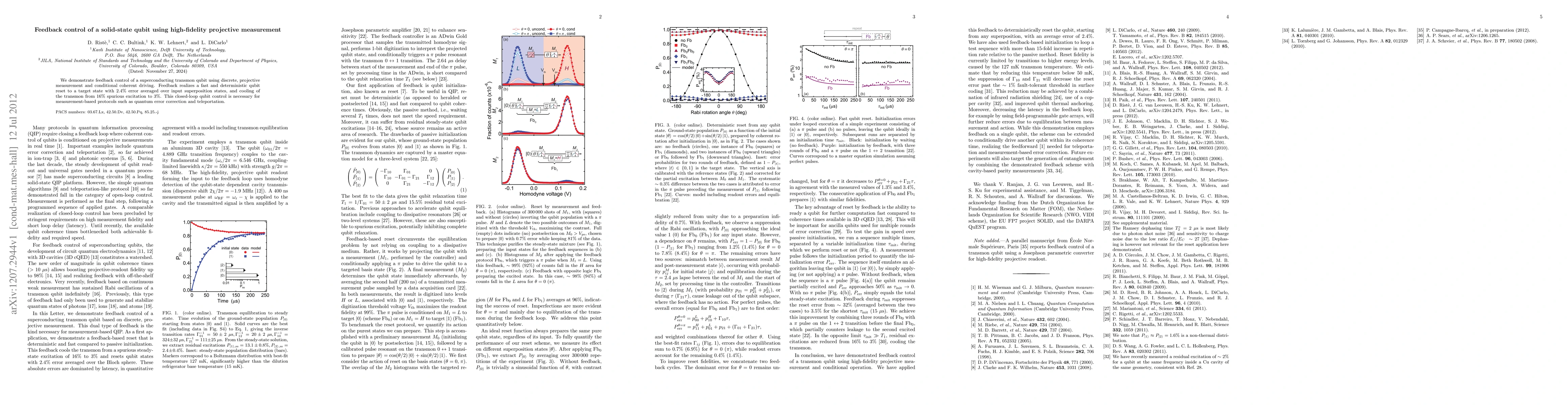 This paper presents a method for feedback control of a superconducting transmon qubit using high-fidelity projective measurement and conditional coherent driving, achieving a fast and deterministic qubit reset with a 2.4% error rate and reducing spurious excitations from 16% to 3%. This technique is crucial for quantum error correction and teleportation protocols.