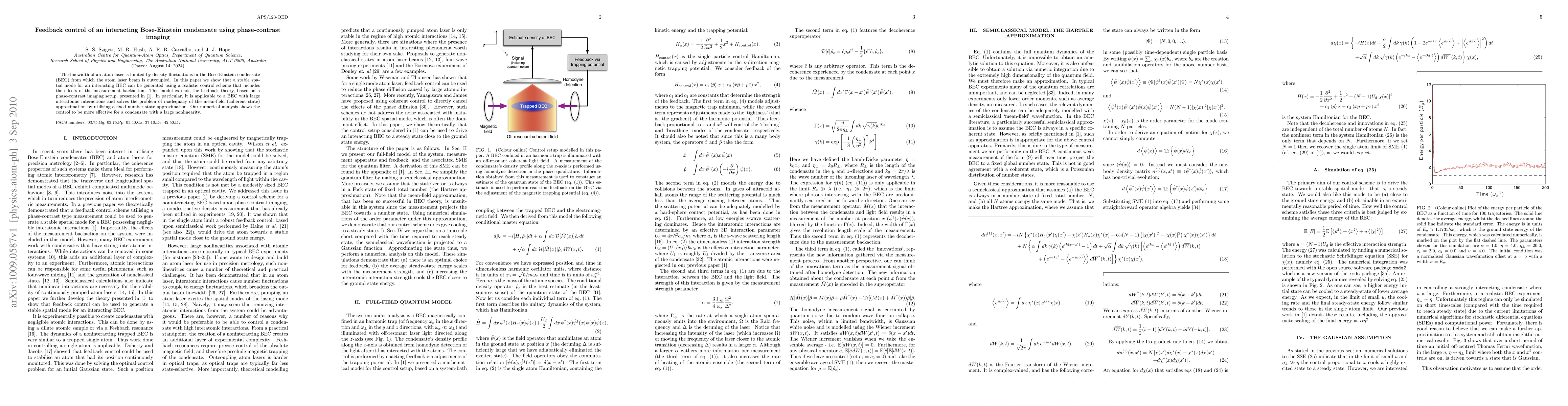 This paper proposes a feedback control scheme for an interacting Bose-Einstein condensate (BEC) using phase-contrast imaging, addressing density fluctuations that limit atom laser linewidth. The model extends previous feedback theory, effectively managing measurement backaction and large interatomic interactions, improving control efficacy for highly nonlinear condensates.