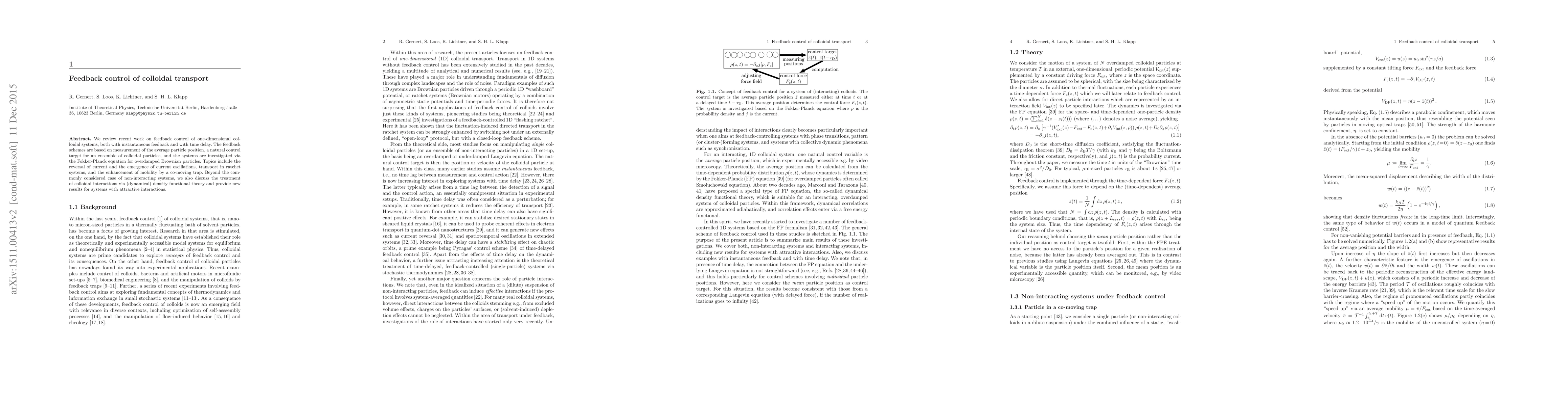 This paper reviews recent advancements in feedback control of colloidal transport in one-dimensional systems, exploring both instantaneous and delayed feedback mechanisms. It investigates the reversal of current, current oscillations, and enhanced mobility, incorporating both non-interacting and interacting colloidal particles using dynamical density functional theory.