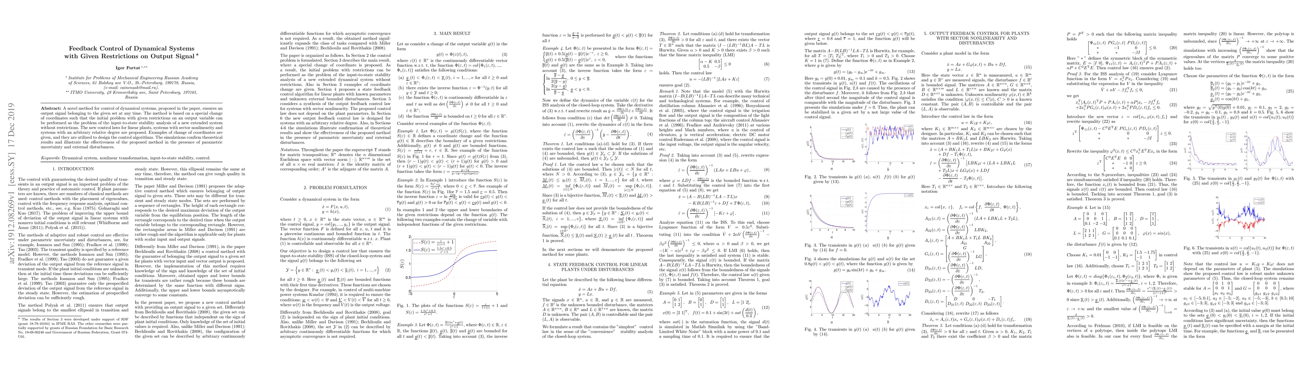 A novel method for control of dynamical systems, proposed in the paper, ensures an output signal belonging to the given set at any time. The method is based on a special change of coordinates such that the initial problem with given restrictions on an output variable can be performed as the problem of the input-to-state stability analysis of a new extended system without restrictions. The new control laws for linear plants, systems with sector nonlinearity and systems with an arbitrary relative degree are proposed. Examples of change of coordinates are given, and they are utilized to design the control algorithms. The simulations confirm theoretical results and illustrate the effectiveness of the proposed method in the presence of parametric uncertainty and external disturbances.