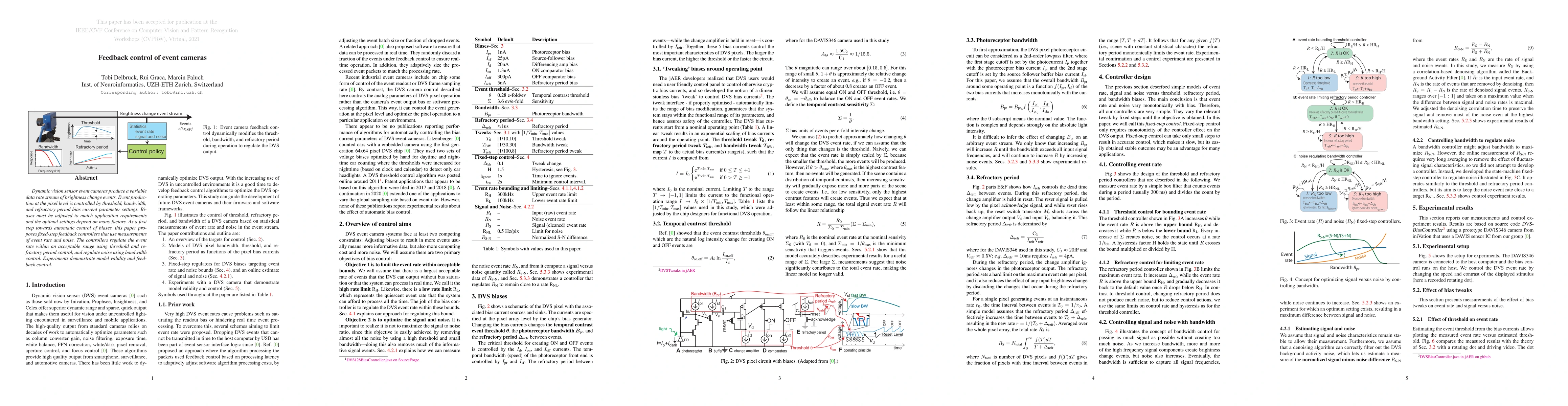 Dynamic vision sensor event cameras produce a variable data rate stream of brightness change events. Event production at the pixel level is controlled by threshold, bandwidth, and refractory period bias current parameter settings. Biases must be adjusted to match application requirements and the optimal settings depend on many factors. As a first step towards automatic control of biases, this paper proposes fixed-step feedback controllers that use measurements of event rate and noise. The controllers regulate the event rate within an acceptable range using threshold and refractory period control, and regulate noise using bandwidth control. Experiments demonstrate model validity and feedback control.