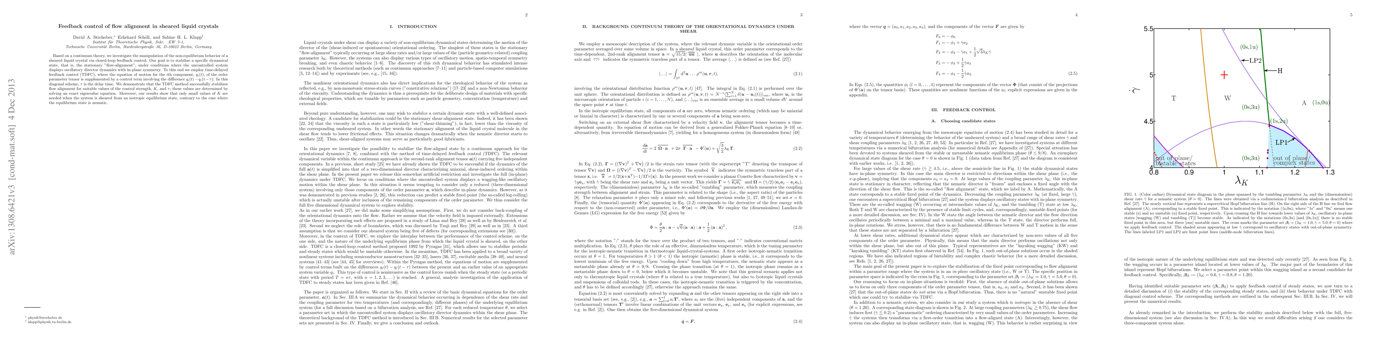 Researchers developed a feedback control method to stabilize flow alignment in liquid crystals under shear, using time-delayed feedback control with small control strengths, which is particularly effective when starting from an isotropic equilibrium state.