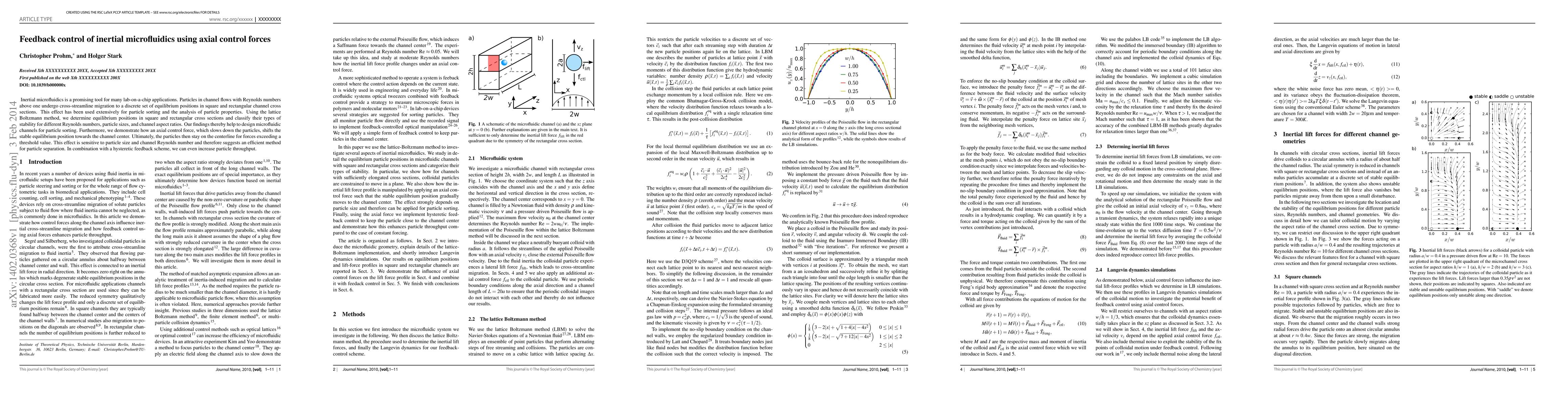 This paper explores inertial microfluidics for lab-on-a-chip applications, detailing the use of axial control forces to manipulate particle migration and equilibrium positions. The study employs the lattice Boltzmann method to analyze the stability of these positions, revealing a method for efficient particle separation and increased throughput via feedback control.